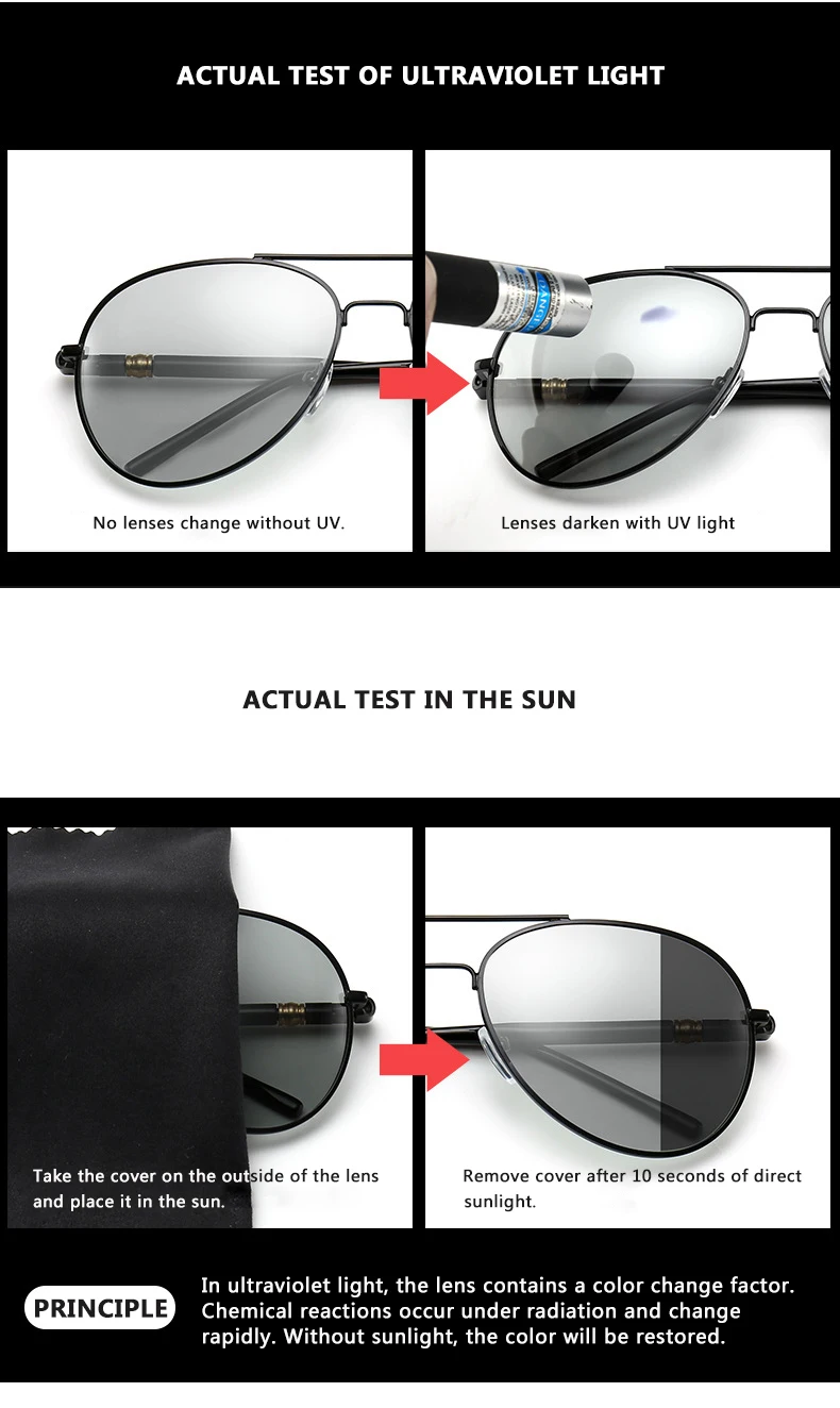 поверил очки в деле, они не фотохромные. никак не реагируют на солнечный свет. Не берите этот товар. ещё очки очень сильно пахнут дешёвым поамтиком