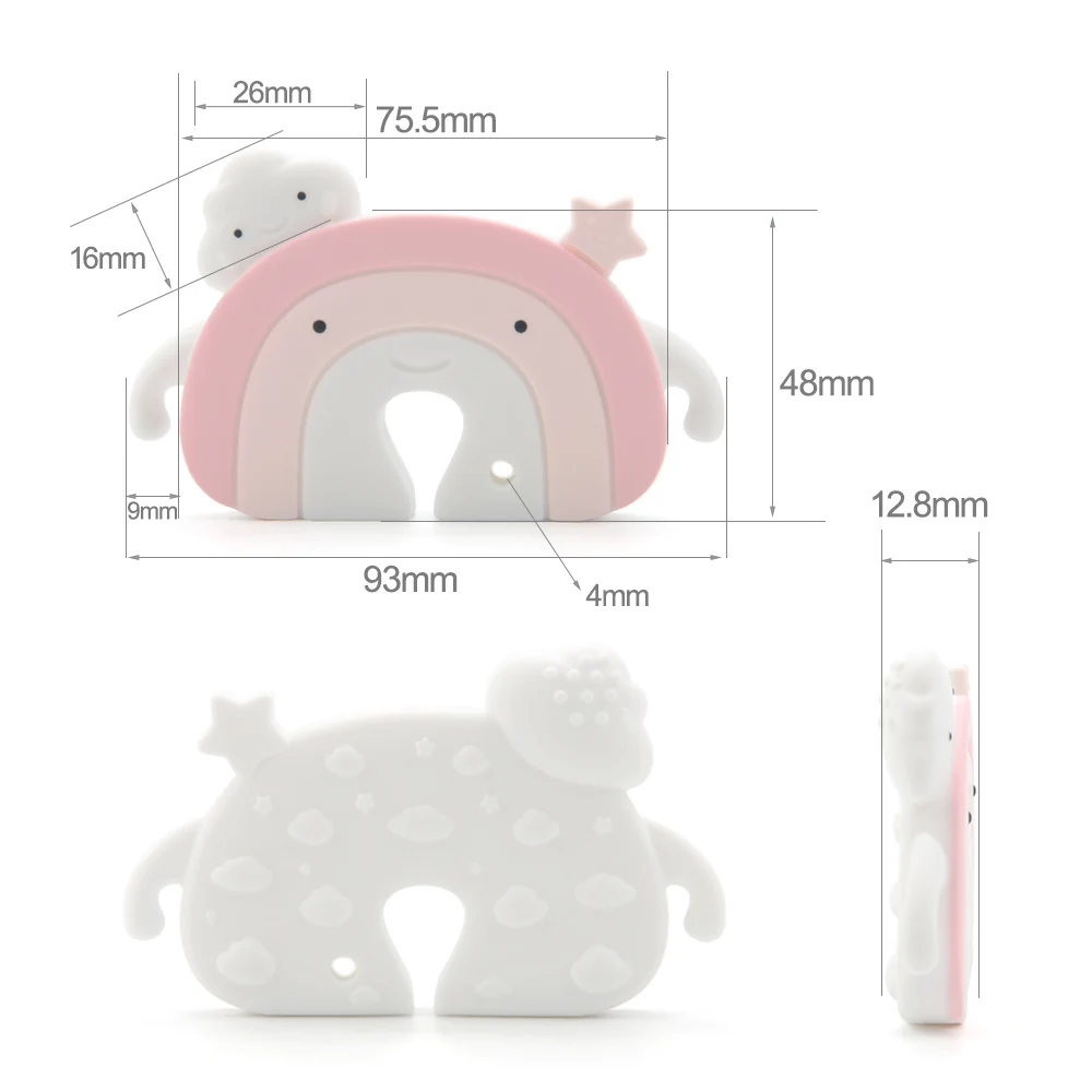 -Силиконовый Радужный Прорезыватель- Количество: 1 шт. Размер: 48*93 мм Цвета: 2 цвета -Вы можете оставить нужный вам цвет в комментарии при размещении заказа. -Стимулирует Сенсорное, зрительное и двигательное развитие. -Силиконовые бусины обеспечивают мгновенное облегчение прорезывания зубов и массаж десен. -100% силиконовые шарики, одобренные FDA, не содержат бисфенола А. Без фталатов, кадмий, свинца, ПВХ или металлов. -Легко моется. Рекомендуются дезинфицирующие салфетки для пустышки. Стирать перед использованием! Никогда не оставляйте товар с детьми без присмотра!
