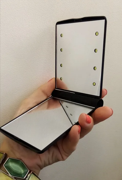 Милое маленькое зеркало. Идеально подходит для моего кошелька. Я еще не пробовал свет, потому что я не могу получить аккумулятор (A23) в моем местном супермаркете, так как это не стандартная батарея здесь, в Дании.