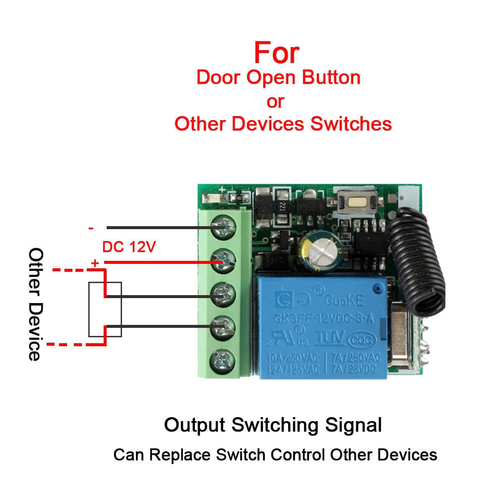 Номер модели: KR1201B-4 Входное напряжение: 12 В Рабочий ток: 10 А Максимальная мощность нагрузки: 110 Вт Частота: 433 МГц Поддержка формата кодирования: EV1527 Способ подключения: NC COM NO Режим работы: Мгновенный, переключение, задержка времени фиксации (5s ,10 с, 15 с)