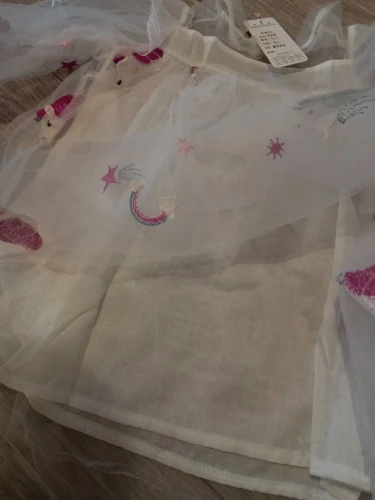 Очень красивое! Как на фото!Немного прозрачное-нужен подъюбник дополнительно одевать.6Т на рост 110