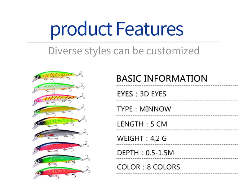 Тип: Искусственная приманка Название продукта: приманка для ловли гольяна Вес: 4,2 г Длина: 5 см Глубина: 0,5-1,5 м Цвет: 8 цветов, цвет s с 2 рыболовными крючками Упаковка: 1 шт. в полиэтиленовом пакете