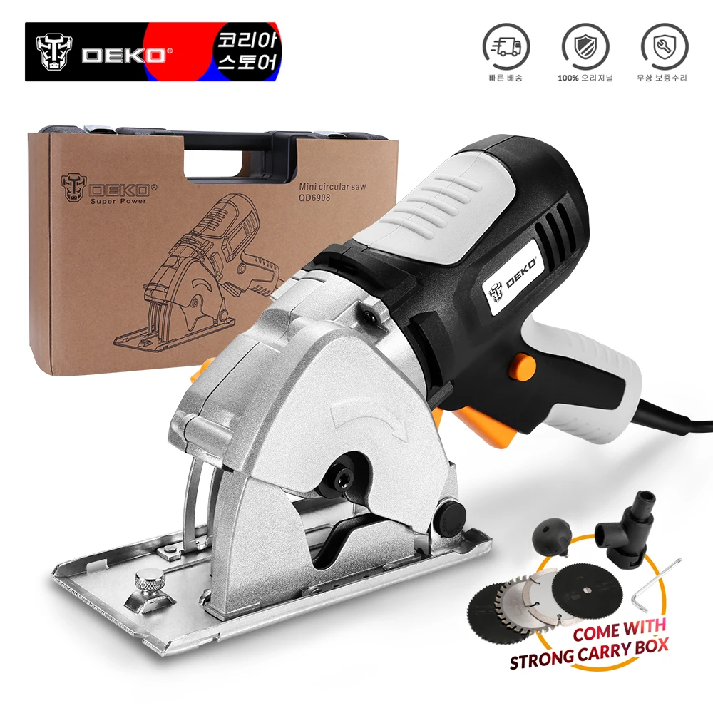 Мини-циркулярная пила DEKO (QD6908)-мощная и функциональная циркулярная пила. Нет необходимости в громоздкой циркулярной Пиле, когда компактная циркулярная пила режет дерево/дерево-как материалы/пластмассы/плитки/печатных плат/стекловолокна армированного пластика в такое же количество времени с легкостью и комфорт, благодаря легкому и компактному дизайну. С мини-циркулярной пилой DEKO легко, удобно и контролируется, и только одной рукой. И эргономичная ручка управления делает его самым быстрым, простым и самым современным инструментом в вашем ящике инструментов.