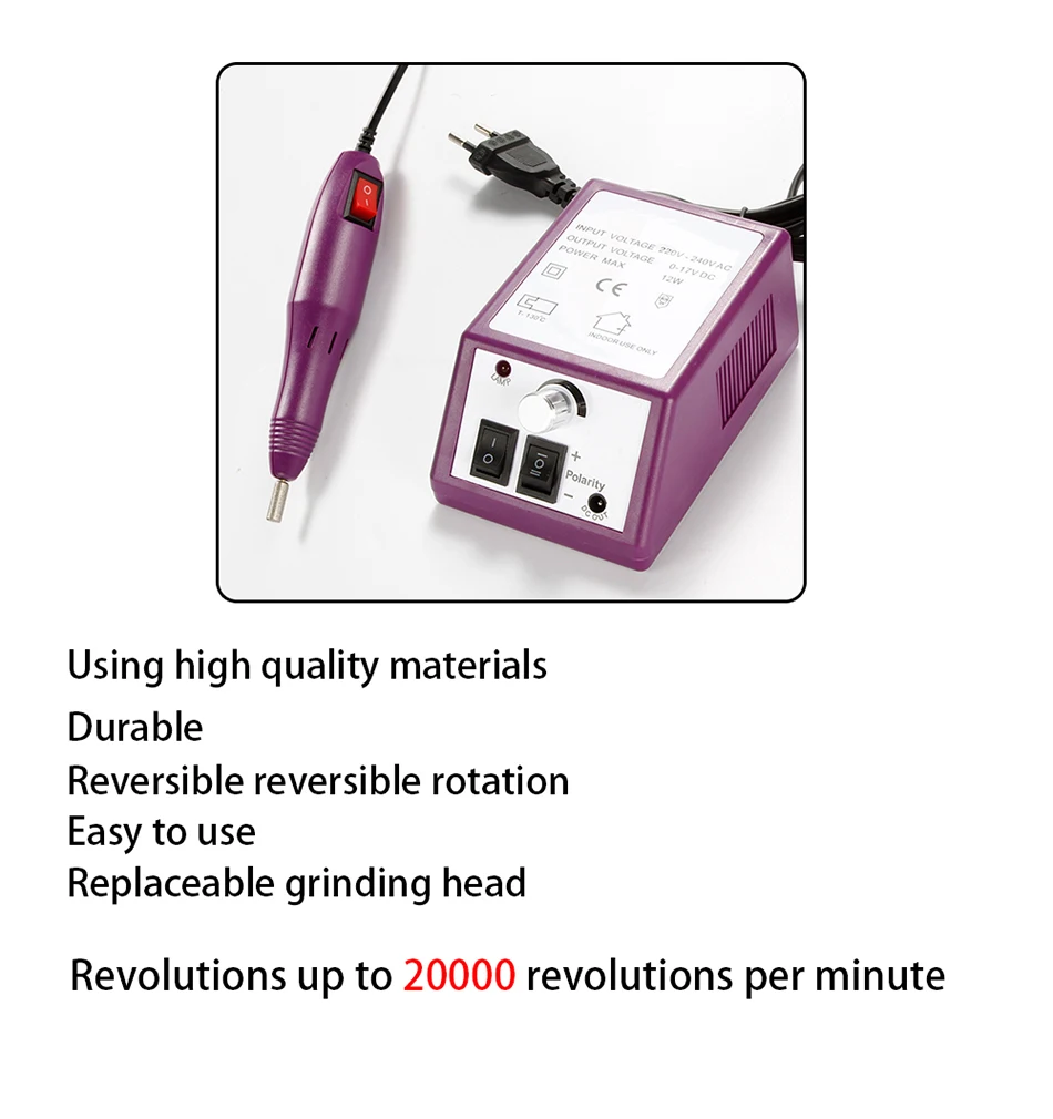 Особенности:Простое в использовании управление скоростью.Автоматическая система защиты от перегрузкиЛегкая конструкция ручки для удобного захвата и удобства использования включает в себя 6 стандартных бит/насадок для храненияДля повседневного ухода за телом этот набор для маникюра и педикюра является идеальным дополнением.С этими единицами вы можете легко и мягко относиться к рукам и ногам до эталона совершенства и элегантности.Для педикюра и маникюра.Подходит для профессионального использования, маникюрного салона или домашнего использования. Примечание:1. Прежде чем мы отправим товар, мы тщательно проверим его. Но мы не можем контролировать повреждение во время транспортировки. Если продукт не может работать, пожалуйста, сначала сообщите нам. Мы можем повторно отправить вам новый. Спасибо за понимание.2. Обратите внимание, что есть две разные вилки. Вилка европейского стандарта с круглой головкой, а вилка стандарта США-с плоской головкой. Когда вы делаете заказ, пожалуйста, обратите на это внимание.
