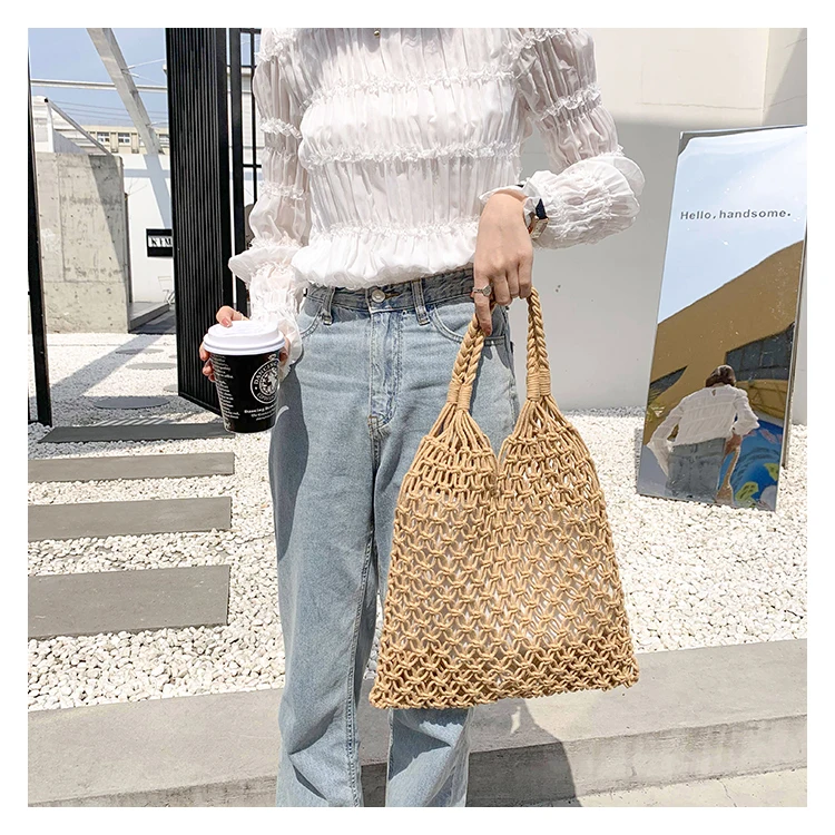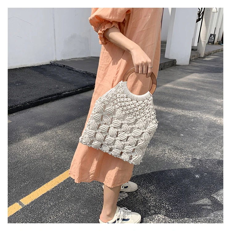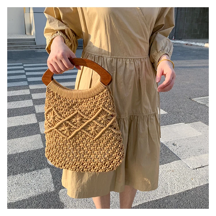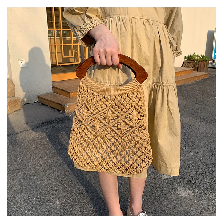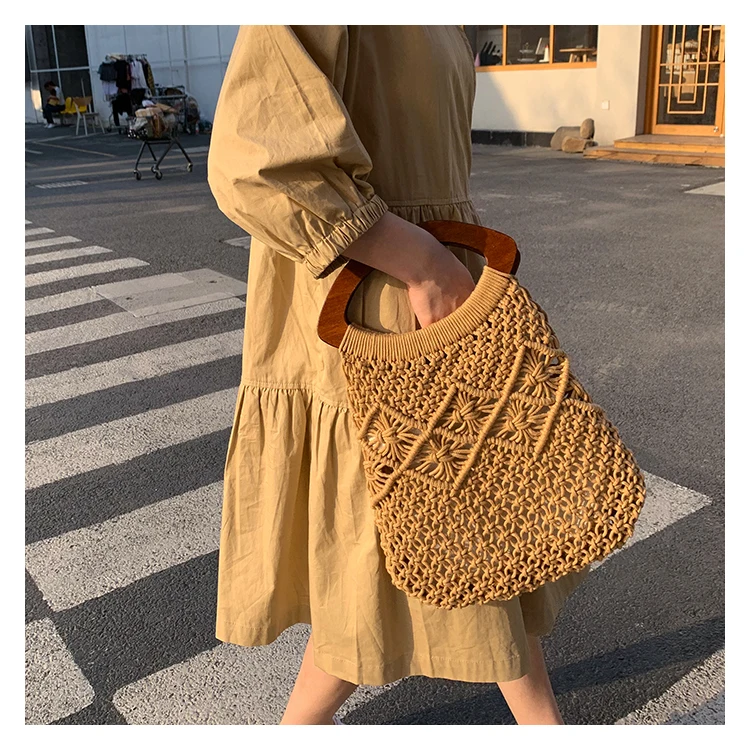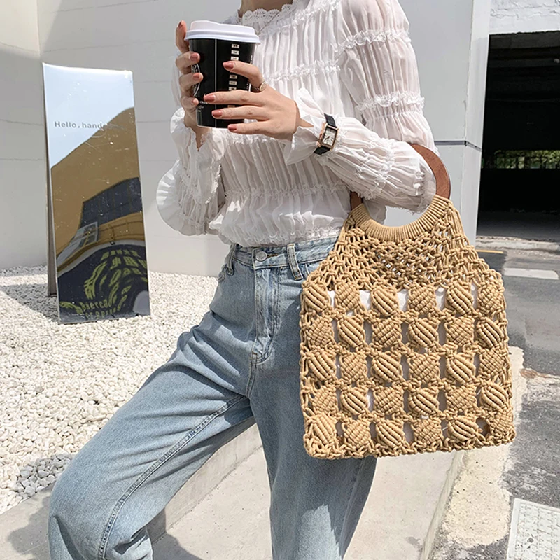 Женская Соломенная Сумка-тоут, винтажная большая пляжная сумка из ротанга с деревянной ручкой, лето плетеная лоза