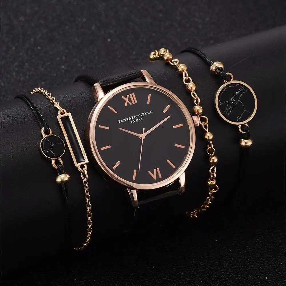 5 шт. Топ стиль женские модные роскошные кожаные ремешок аналоговые кварцевые наручные часы женские часы Женское платье Reloj Mujer черный