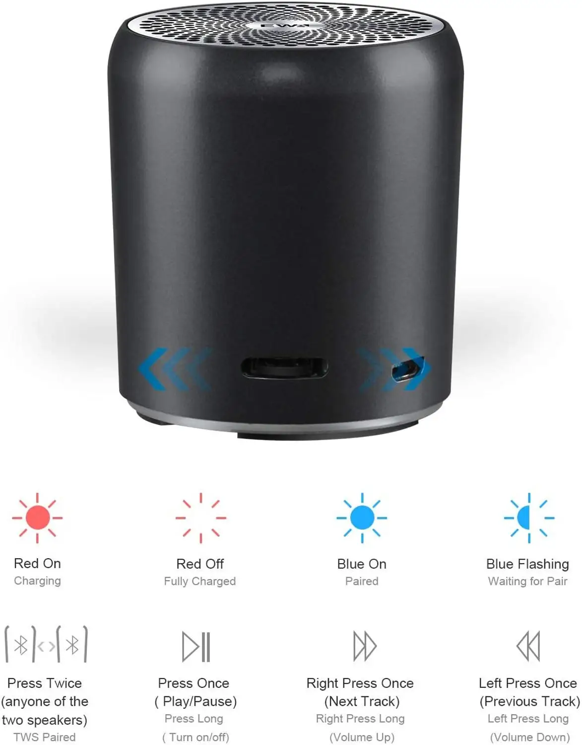 для такой малышки,звук неожиданно громкий. басы присутствуют. корпус из металла с покрытием софт тач. есть вход под микро сд. кнопка на колонке только одна. долгое нажатие -включение/выключение. влево/вправо одно нажатие переключает трек на следующий или предыдущий. долго влево- уменьшить громкость, долго вправо- увеличить громкость. сначала подумала,что управление только с источника, уж слишком немногофункционально выглядит эта кнопочка. колонка пришла в футляре,с зарядкой и инструкцией. малютка бомба! не хрипит,не кряхтит, басит. трек полностью отслеживается. магазин советую!