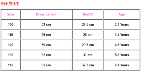 Размеры Длина платья Бюст * 2 Возраст 100 43 см 26,5 см От 2 до 3 лет 110 46 см 28 см От 3 до 4 лет 120 49 см 29,5 см От 4 до 5 лет 130 52 см 31 см От 5 до 6 лет 140 55 см 32,5 см От 6 до 7 лет