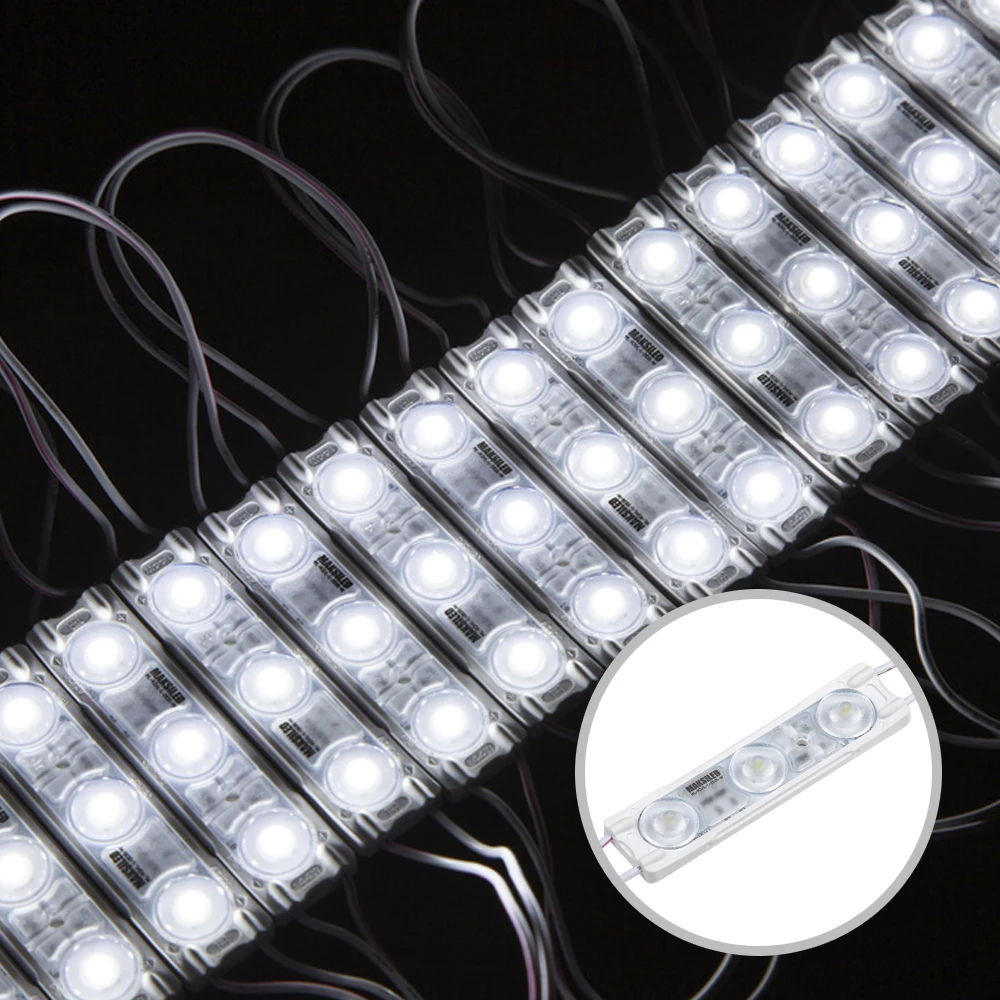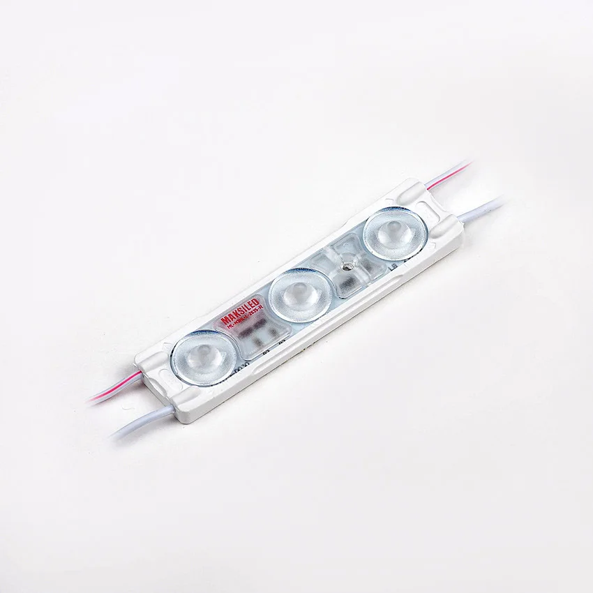 Модуль влагозащищенный с линзами. Отличное решение для создания ярких световых коробов и объемных букв глубиной 80–120 мм • Высокоэффективные светодиоды 2835; • Система Constant Current (одинаковая засветка модулей в стандартной цепи); • Уникальный дизайн линзы, обеспечивающий плотную и равномерную засветку на поверхности; • Алюминиевая плата для лучшего теплоотвода; • Корпус из ABS пластика с добавлением файбера, повышающего устойчивость корпуса к перепадам температур и предотвращающего его разрушение.