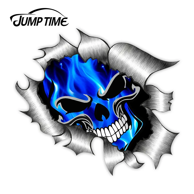 Время скачка для 13 см рваный металлический 3D дизайн с черепом и электрическим синим пламенем внешняя виниловая Автомобильная наклейка для бампера окон