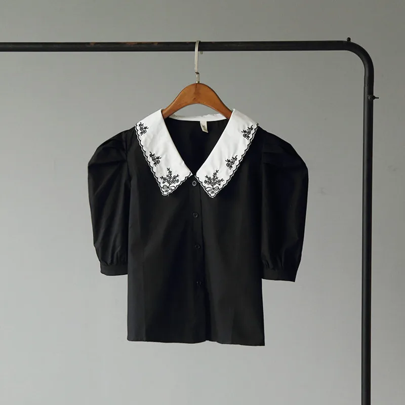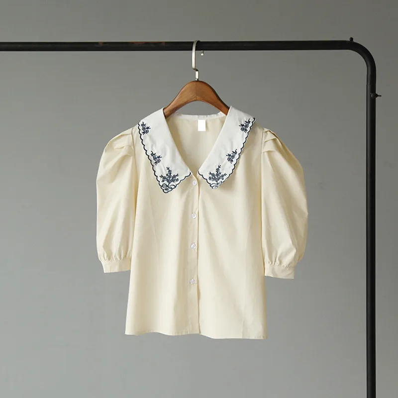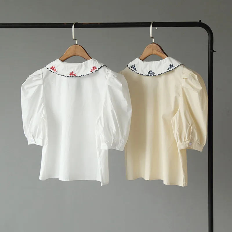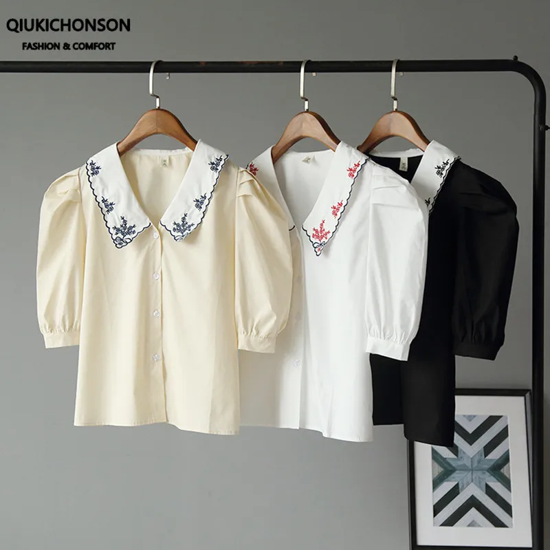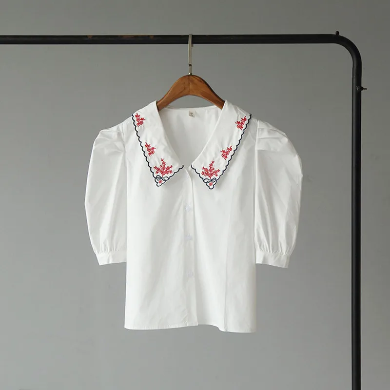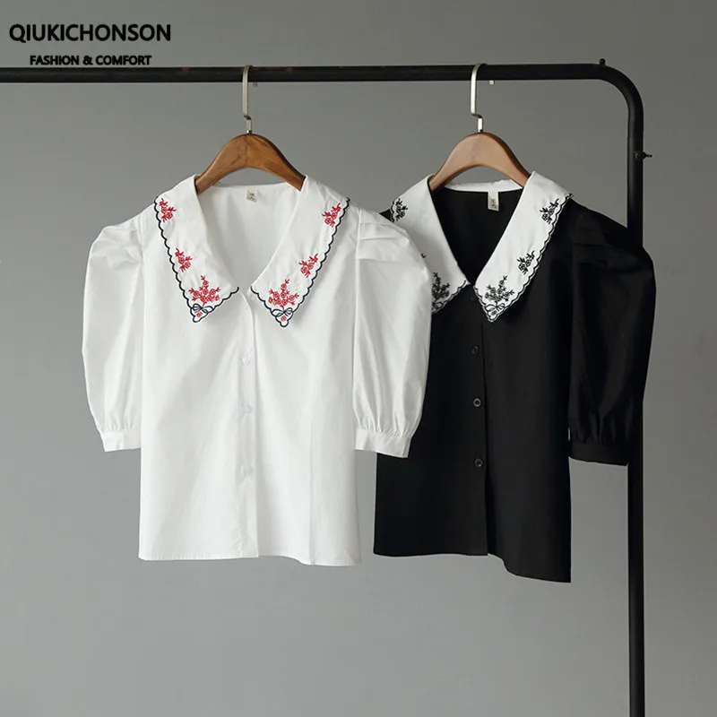 Корейская милая блузка Qiukichonson с пышными рукавами, женские топы, летняя винтажная белая рубашка с вышитым воротником контрастных цветов для женщин icon star icon star icon star icon star icon star