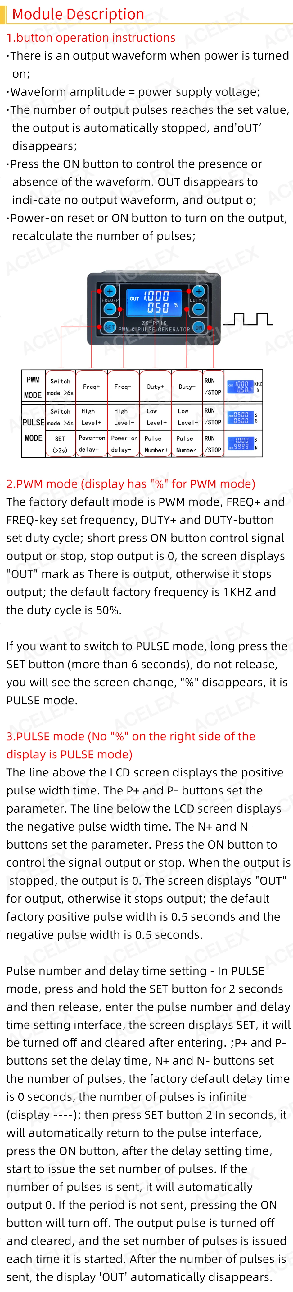 Линия над ЖК-экраном отображает положительную ширину импульса. Кнопки P + и P задают параметр. Линия ниже ЖК-экрана отображает время отрицательной ширины импульса. Кнопки N + и N задают параметр. Нажмите кнопку ON для управления выходом сигнала или остановки. Когда выход остановлен, выход 0. На экране отображается «выход» для выхода, в противном случае он прекращает выход; Завод по умолчанию позитивную ширину импульса составляет 0,5 секунд и отрицательную ширину импульса составляет 0,5 секунд.