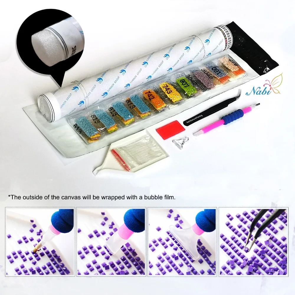 6. Размер изделия-это размер фактического экрана. Продукт включает в себя: холст, алмаз, точечная ручка, металлический пинцет, твердый клей, Алмазный лоток, мешок ziplock.