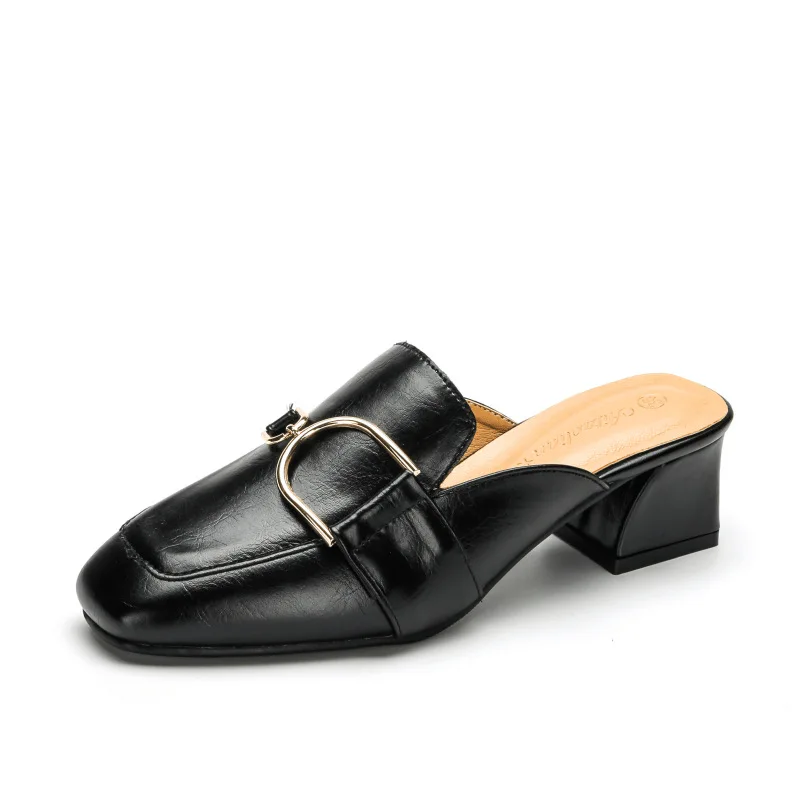 Мюли женские кожаные на низком каблуке, без застежки, квадратный носок, Золотая Пряжка, повседневные Черные шлепанцы, сланцы, JJ126