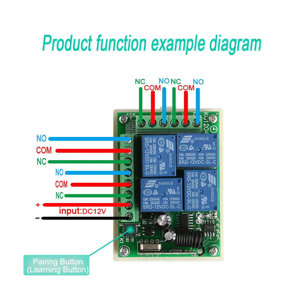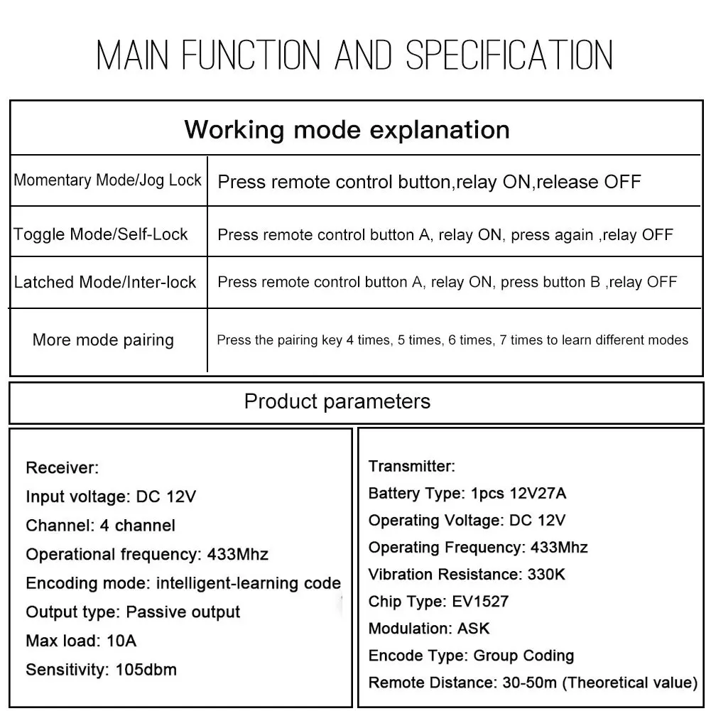 1. Рабочее напряжение: DC12V2. Статический ток: 8 мА3. Рабочая частота: 433 МГц4. Мощность нагрузки: 10А на нагрузку5. Чувствительность приема: -105dbm6 、 отклонение частоты: ± 0,2 МГц7. Режим кодирования: тип обучения8. Режим работы: точечное движение, самоблокировка, блокировка, (Двусторонняя точка перемещения/две блокировки) (Двусторонняя блокировка/две блокировки) (Две блокировки/две блокировки)9. Режим модуляции: ASK10. Расстояние телеуправления: 100 м (открытое пространство без помех)11. Размер PCBA: 68 мм/48 мм/18 мм12. Размер корпуса: 76 мм, 56 мм, 30 мм