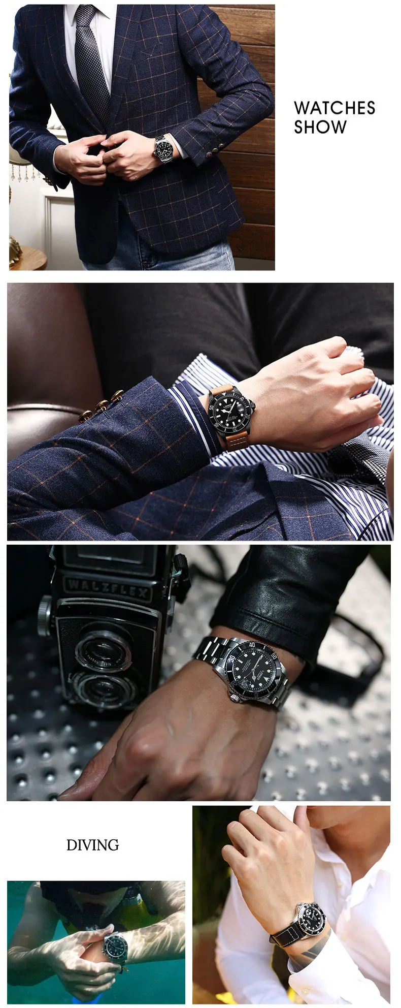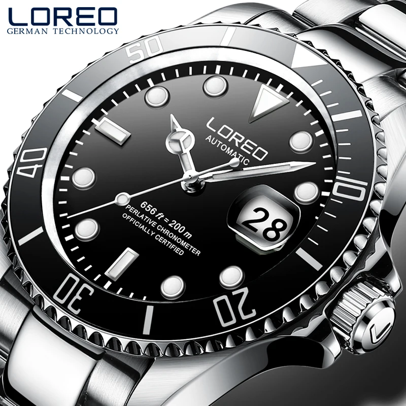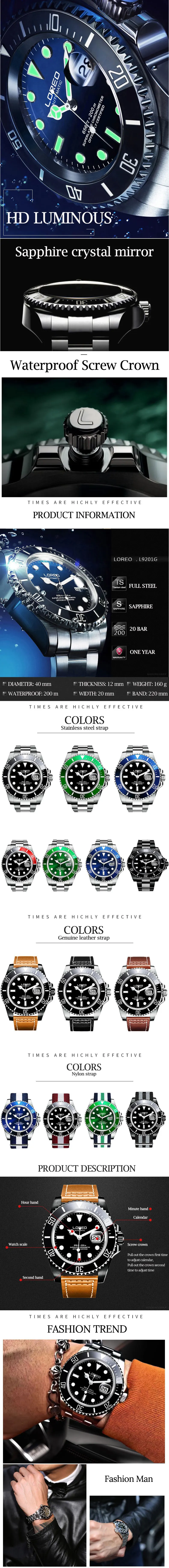Водонепроницаемые часы Relogio 200 м, роскошный бренд LOREO, модные автоматические часы с сапфировым календарем, светящиеся спортивные часы для мужчин