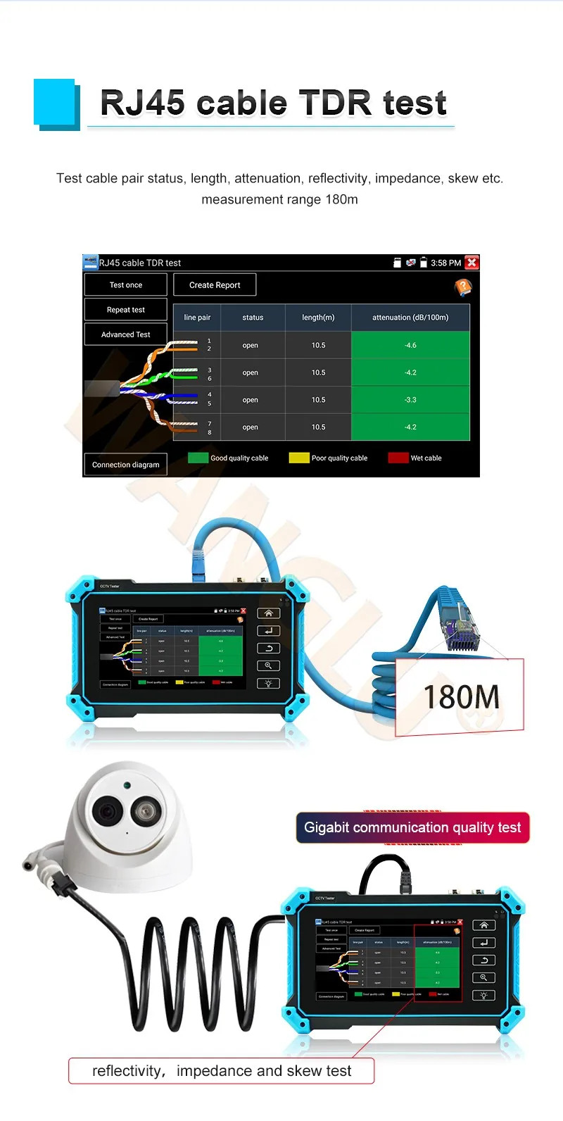 ● Тестирование кабеля RJ45 TDR, открытие кабеля, испытание шорт и длины, макс. 180 м.
