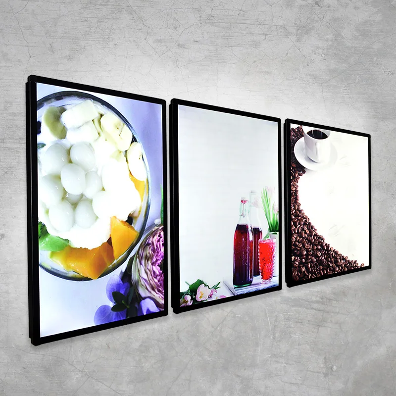 Наши продукты широко используются в цепи продуктов питания и напитков. Изысканный, бесшовный, высокий светильник Гладкая. Есть 2 магнита в горизонтальной стороне для открытия, чтобы легко отсоединить и установить плакат.