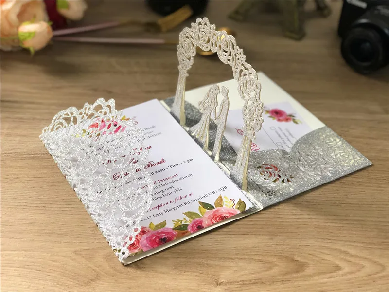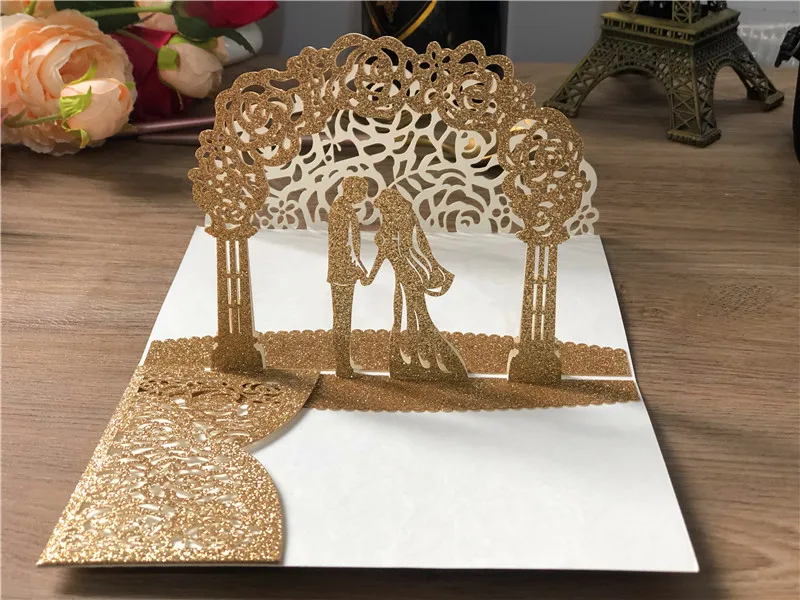 Свадебные приглашения с 3D выдвижным рисунком, держатель для свадебных карт с лазерной резкой, с конвертом, под заказ, цвета серебра, розового золота, шампань, 50 шт.