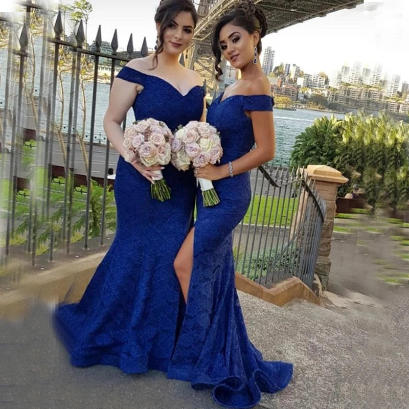 Синие кружевные платья-русалки для подружек невесты с открытыми плечами и Боковым Разрезом, свадебные платья со шлейфом для гостей сада и страны
