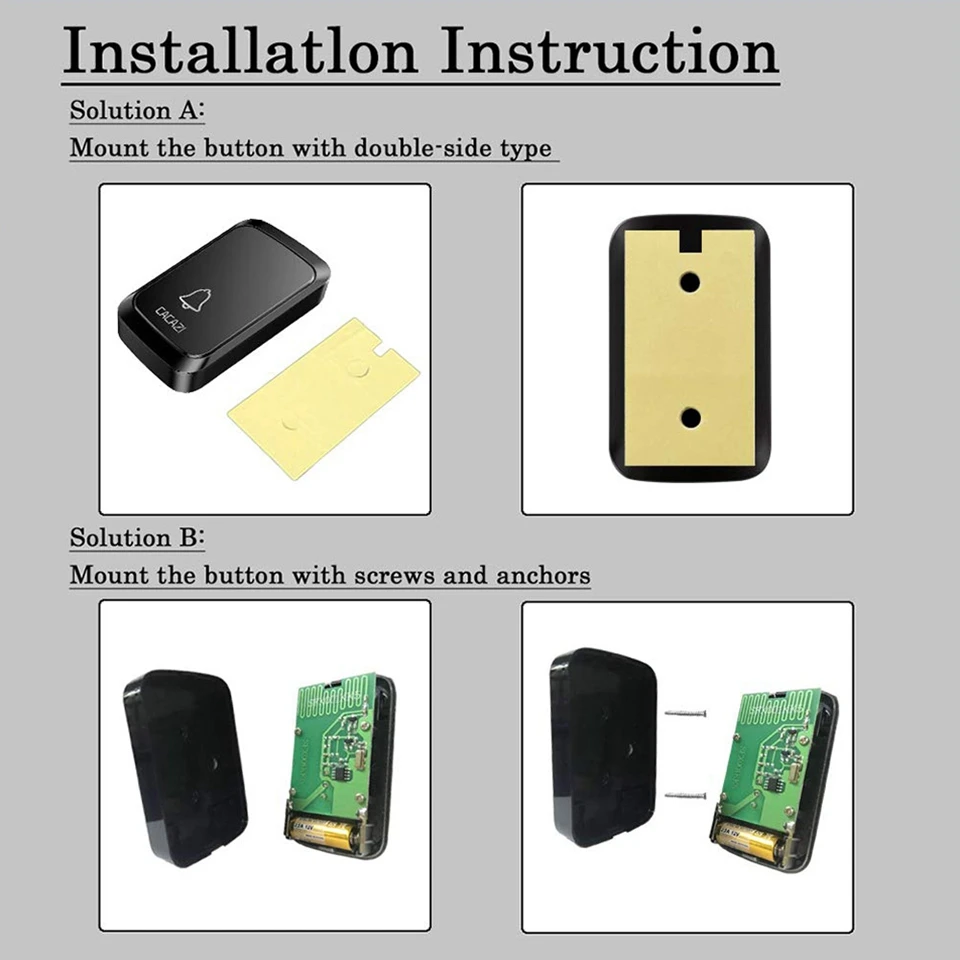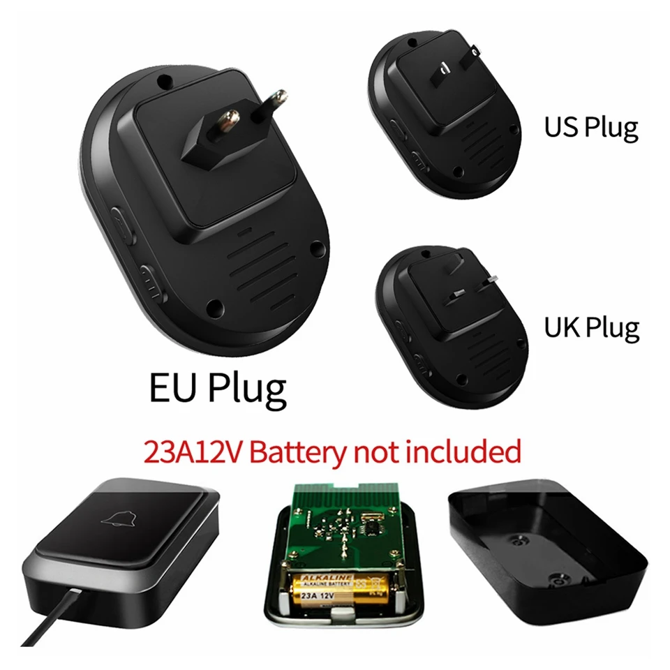 1.Передатчик использует щелочную батарею 23A12V (аккумулятор в комплект не входит). 2. Передатчик не имеет винтового патрона, он может быть водонепроницаемым и пыленепроницаемым без резинового кольца. 4. Если несколько кнопок соединены с одним или несколькими приемниками в одной системе, каждая кнопка может быть установлена на другой мелодии звонка. 5. Функция отключения памяти: Включите питание снова после выключения питания, не нужно повторно регулировать и блокировать мелодию звонка. 6. Приемник доступен в различных вилках, штепсельных вилках США/ЕС/Великобритании и адаптерах Австралии, подходит для большинства стран. 7. Привлекательная подсветка мигает, когда кто-то толкает дверной звонок. Особенно подходит для пожилых, глухих и беременных женщин. 8. Напряжение приемника составляет 220 В. 9. Приёмник находится на расстоянии 300 метров (на открытой местности), что может зависеть от окружающей среды и препятствий. 10. Приемник имеет 58 мелодий на выбор, и громкость составляет 20-110 дБ в 4 уровнях. 11. Размер кнопки: 77*46*20 мм, Размер приемника: 95*65*33 мм 12. Просто подключите приемник к электрической розетке, передатчик кнопки может быть приклеен к двери с помощью прилагаемых клейких лент. Примечание: Кнопка не может быть размещена на железной двери, потому что это будет мешать сигналу.