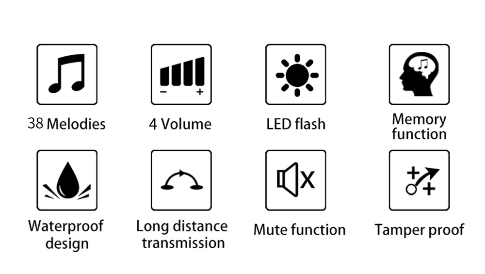 1. Кнопка поддерживает до 20 шт., а приемник-до 100 шт. 2. Передатчик без винтового патрона обеспечивает водонепроницаемость и Пыленепроницаемость. 3. Привлекающая внимание подсветка мигает, когда кто-то толкает дверной звонок. Особенно подходит для пожилых, глухих и беременных женщин. 4. Машинное обучение предотвращает помехи от других беспроводных передатчиков. 5. В передатчике используется щелочная батарея 23 а 12 В (батарея в комплект не входит). 6. Приемник доступен в различных вариантах вилок, вилок US/EU/UK и адаптеров AU, подходящих для большинства стран. 7. Дальность приема: 300 метров на открытой местности 8. На беспроводной сигнал будут влиять препятствия. Чем больше препятствий, тем серьезнее потеря сигнала. 9. Приемник имеет 4 уровня (можно отключить звук) 0-80 дБ, 38 музыки на выбор. 10. Размер: Передатчик: 77x46x20 мм, приемник: 90x56x20 мм Примечание: кнопку нельзя установить на железную дверь, так как она будет мешать сигналу.
