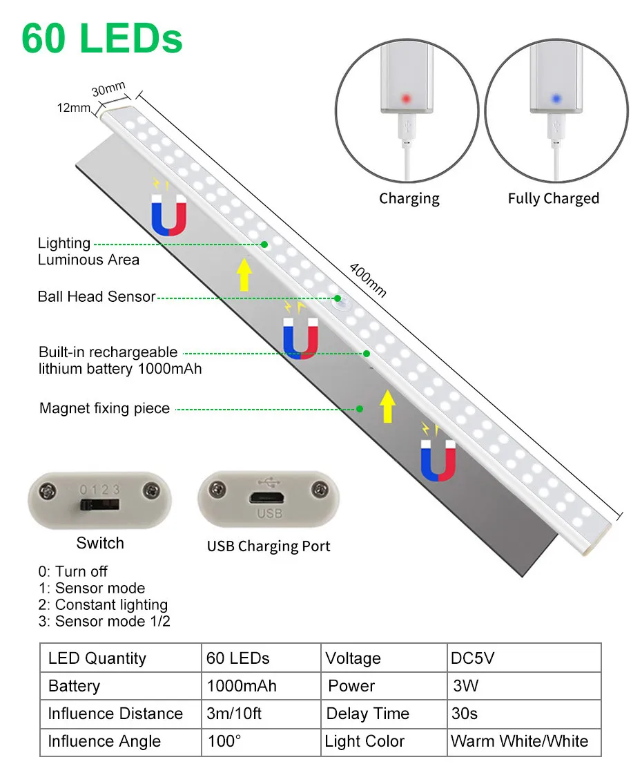 Приглушаемый светильник для шкафа, 610142036 светодиодов, с датчиком движения, аккумуляторный, 244060 светодиодов, светильник, 4 режима, для шкафа, гардероба, кухни