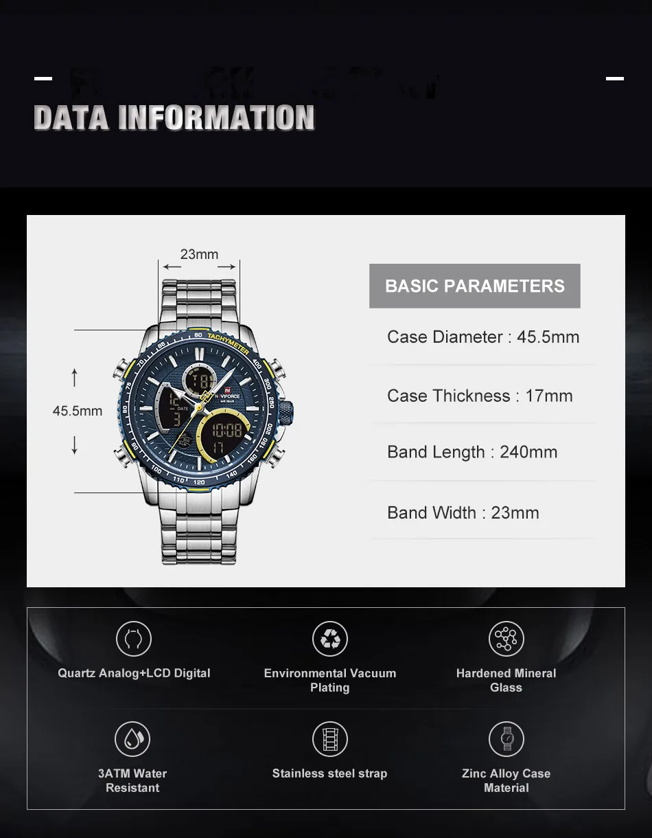 Модель: NAVIFORCE NF9182Механизм: кварцевый механизмПол: мужчин и мужчинСтиль: Модный, Повседневный, СпортивныйМатериал циферблата: закалённое минеральное стеклоМатериал ремешка: ремешок из нержавеющей сталиТип застежки: складная застежка с безопаснойДиаметр циферблата: 45,5 ммЧехол Толщина: 17 ммДлина ремешка: 240 ммШирина ремешка: 23 ммВес изделия: 172 гХарактеристики: Водонепроницаемость до 30 м, отображение даты недели в два раза, хронограф