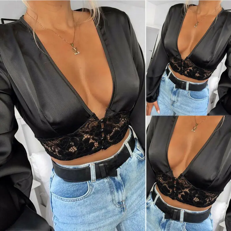 Топ женский кружевной с глубоким V-образным вырезом, облегающий кроп-топ, Элегантная модная повседневная однотонная атласная блузка с длинным рукавом, на лето