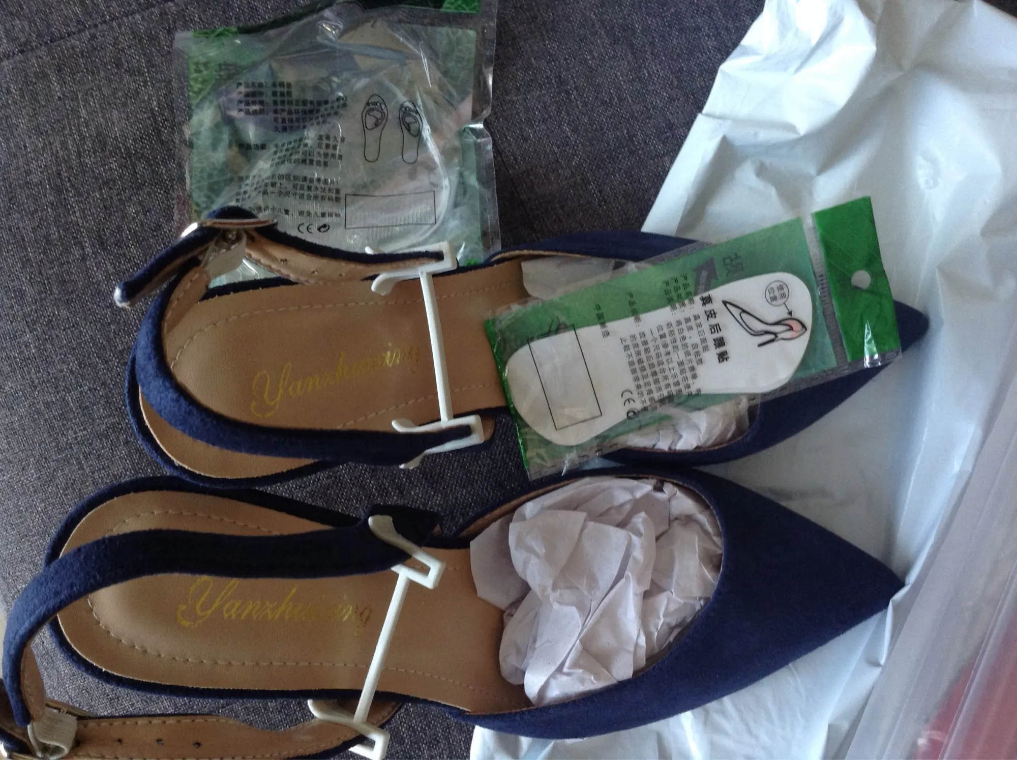 Выглядят отлично, сделано все аккуратно, материал ткань, видно, что не замшевая, но только совсем вблизи смотреть если. Колодка удобная, как тапочки. Так же положили силиконовые мини-стельки, чтобы стопа не скользила и пластыри для щиколотки телесного цвета. Спасибо большое! Пришли за две недели, отправили через 5 дней после оформления заказа. Упаковано было в воздушный пакет, так что они не помялись и пришли в идеальном состоянии!