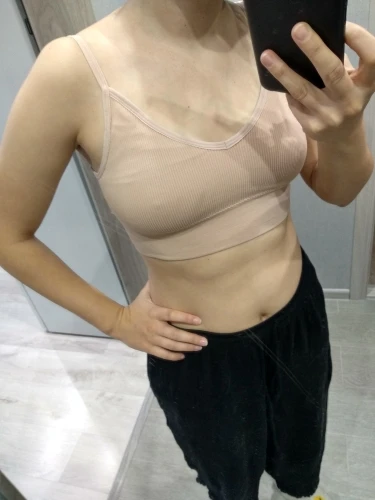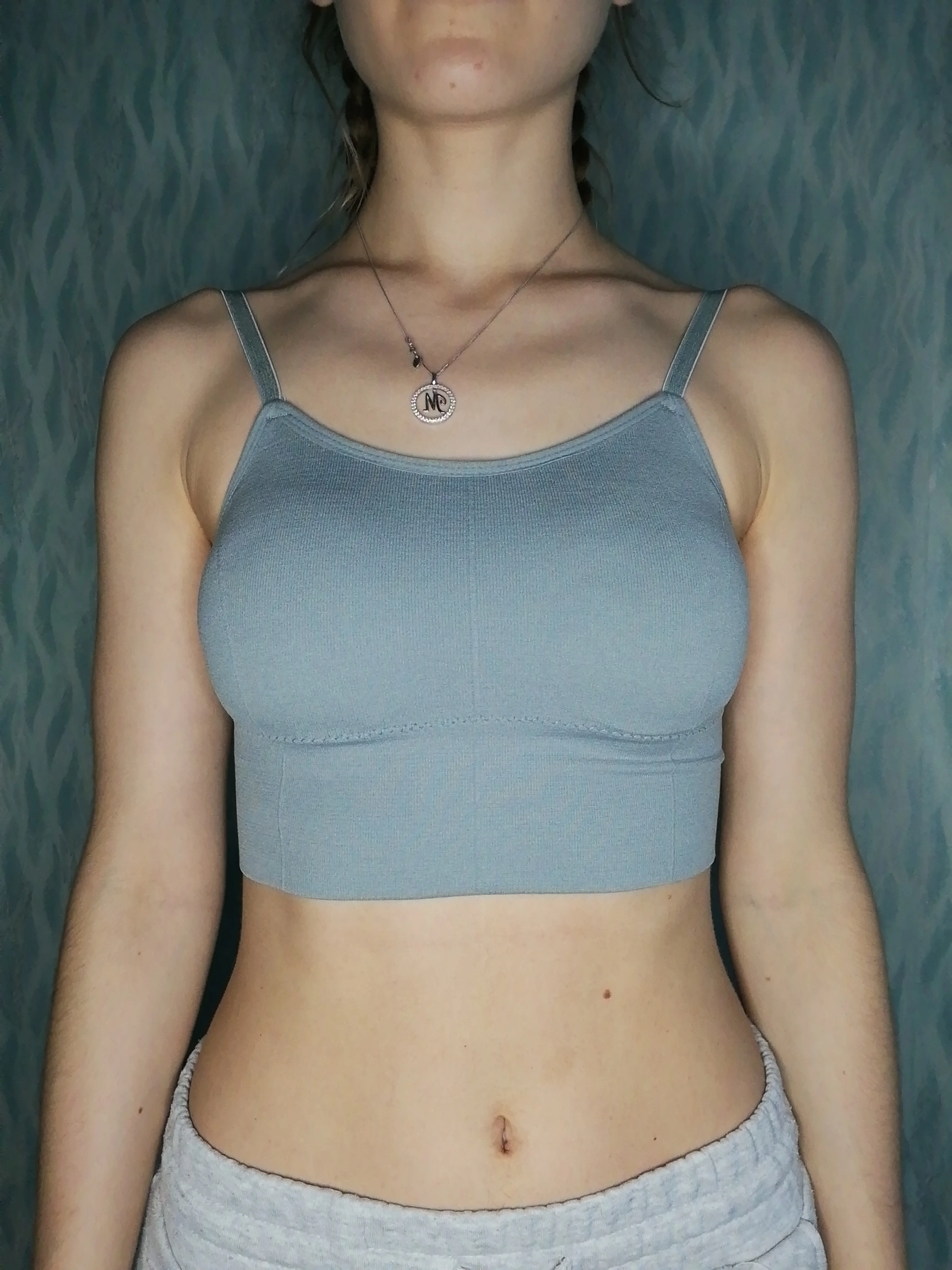 Качество топа отличное, нет неприятного запаха, дошёл быстро. Один минус- видимо при транспортировке, помялись чашечки, которые идут в комплекте. Как их привести в первозданный вид я не знаю, поэтому буду носить без них, тк они искажают форму груди (благо их спокойно можно вытащить из топа).