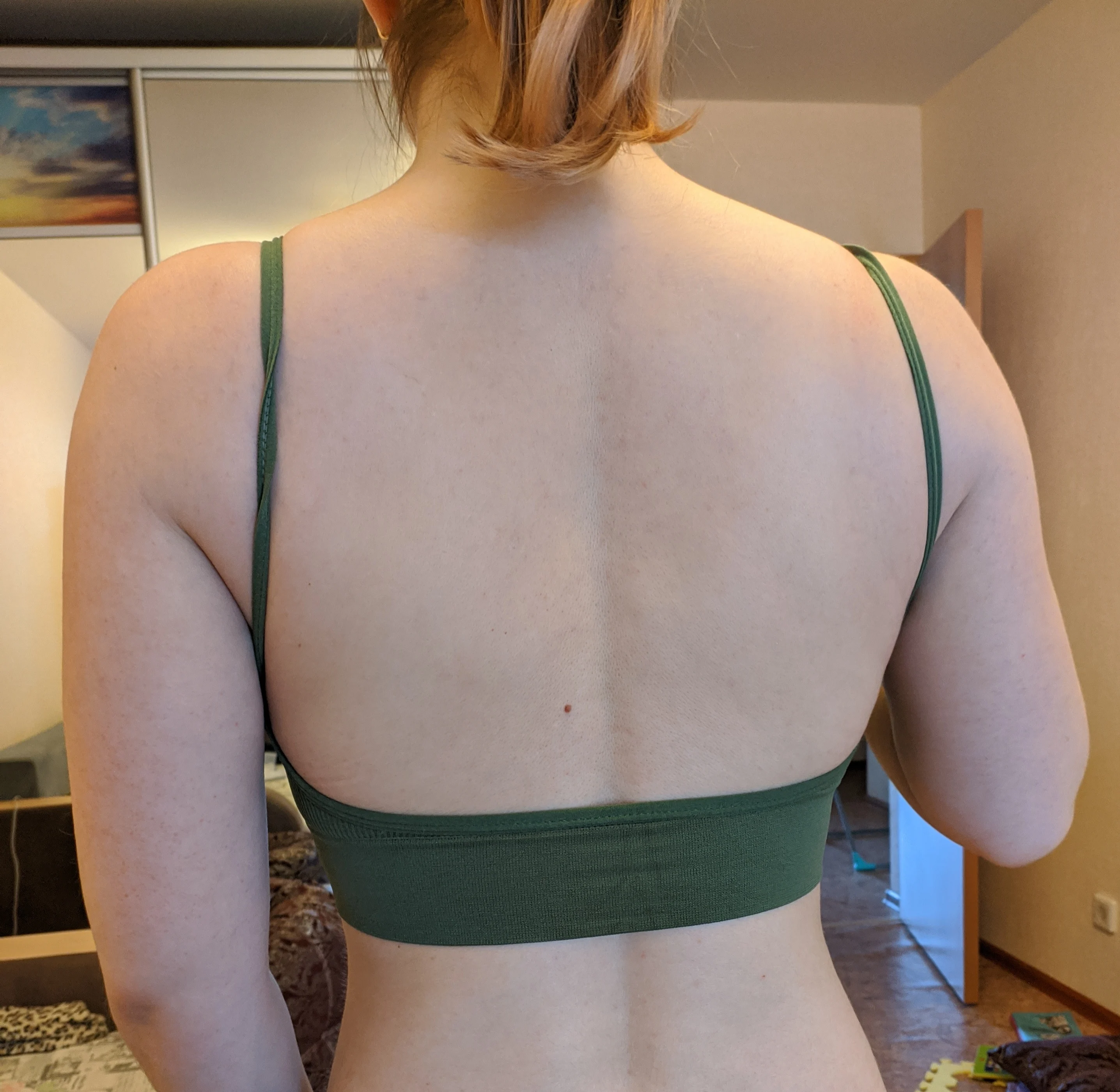 Очень классный топ, мягкий, лямки на спине расположены по бокам таким образом что спина полностью открыта, а резинка достаточно низко находится