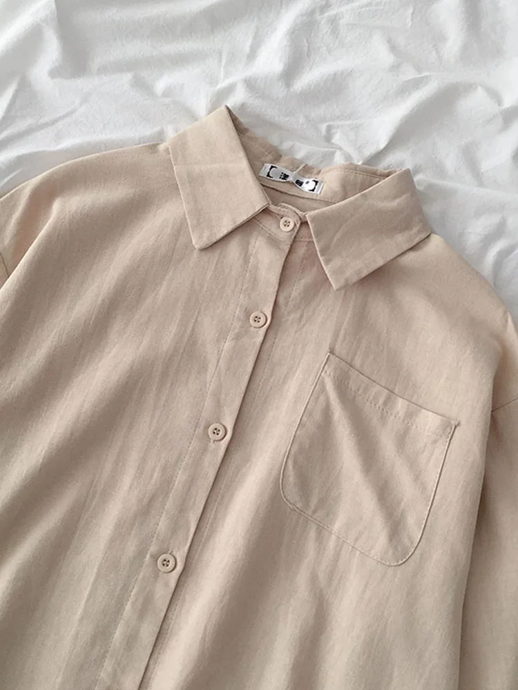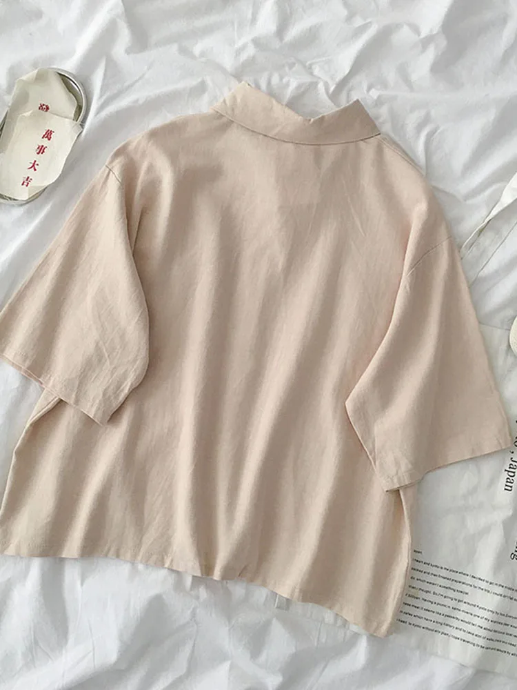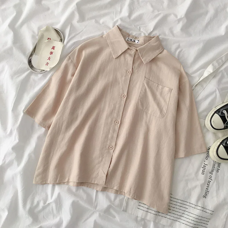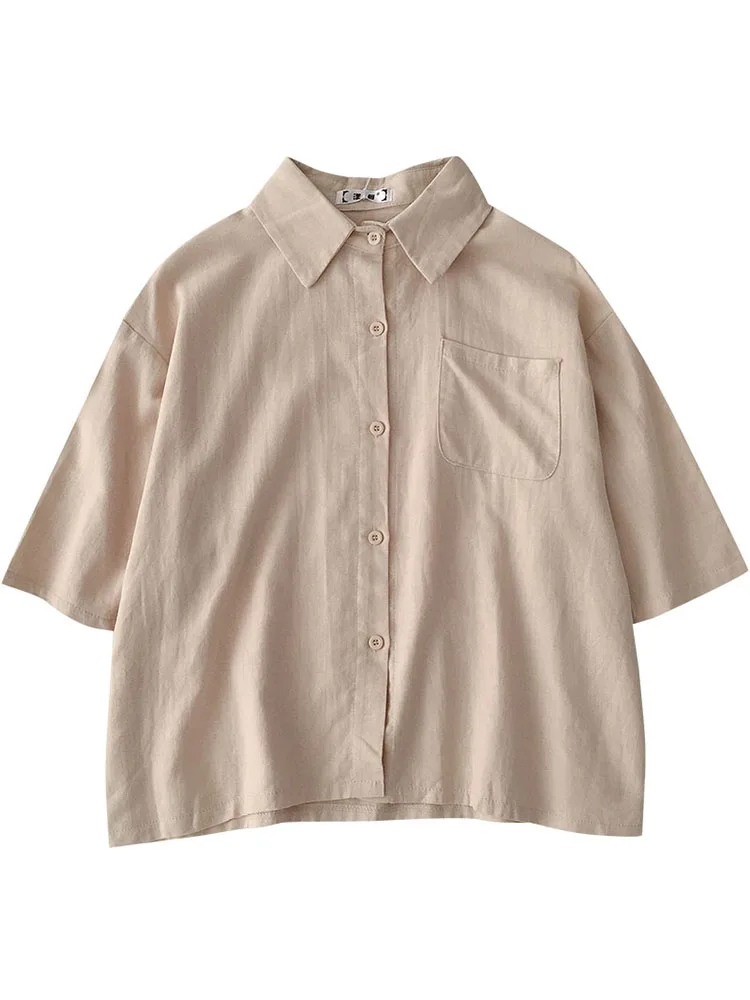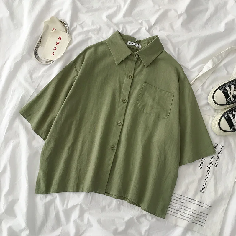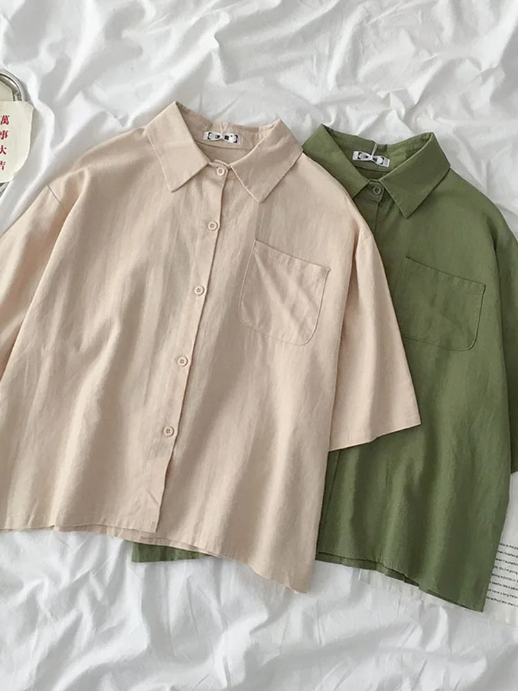 Женская винтажная рубашка с коротким рукавом, однотонная Свободная блузка в Корейском стиле с отложным воротником, повседневные шикарные топы для девушек, лето 2021