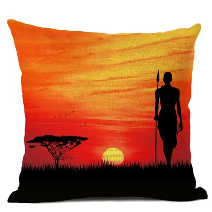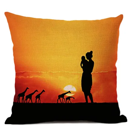 Наволочка хлопковая льняная с изображением Заката На пейзажи Африки человек, слона, жирафа