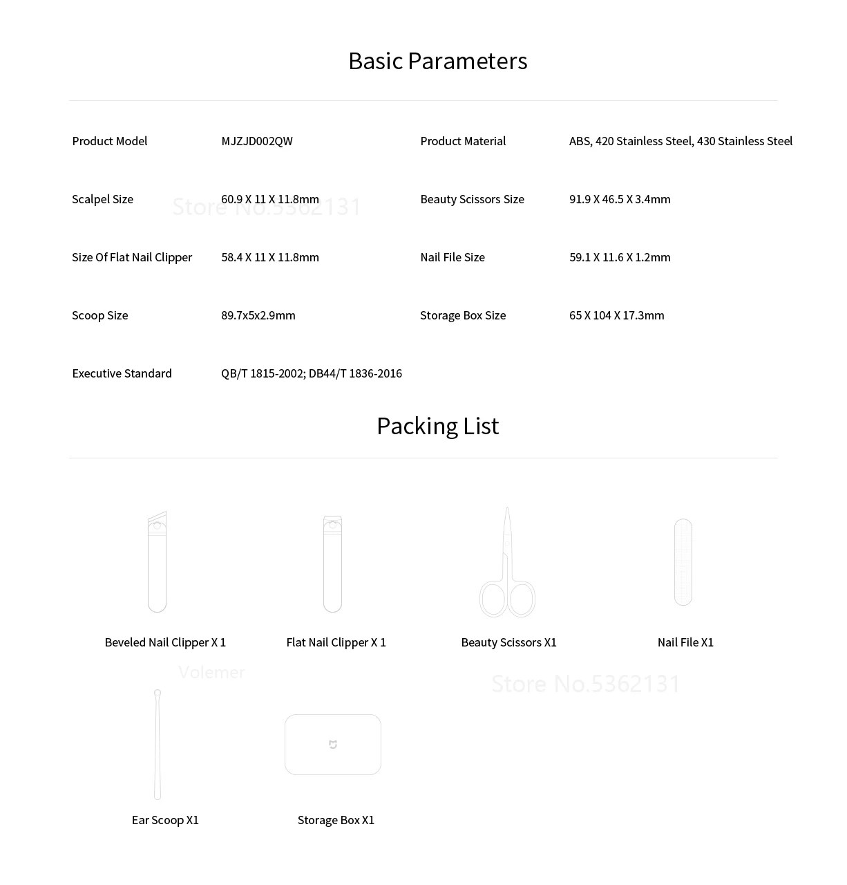 1 * косые кусачки для ногтей 1 * плоские кусачки для ногтей 1 * ножницы для красоты 1 * пилка для ногтей 1 * наушник 1 * коробка для хранения