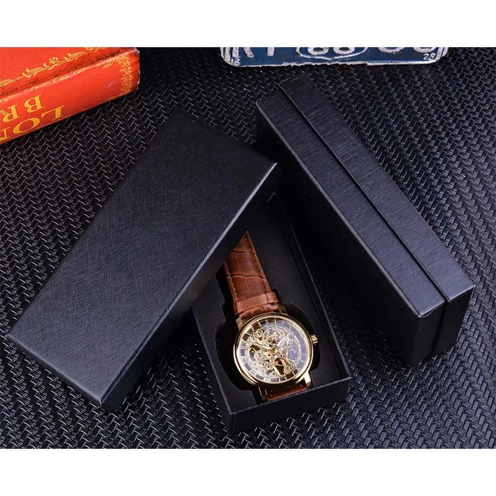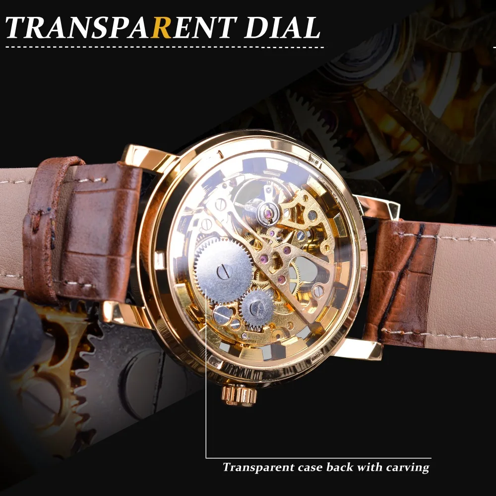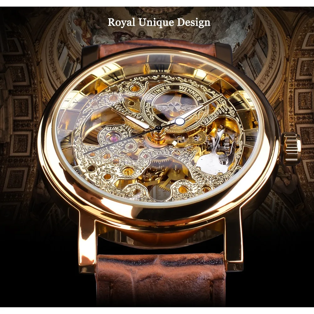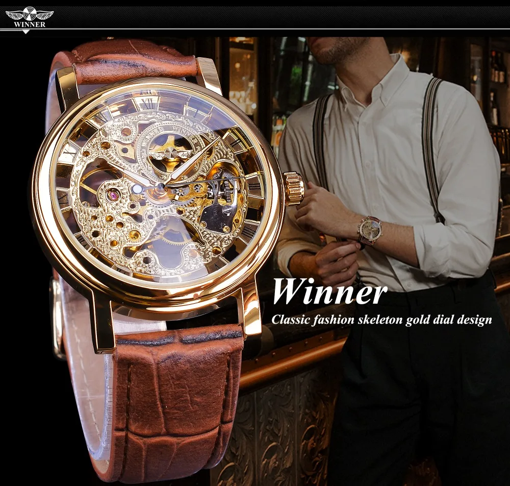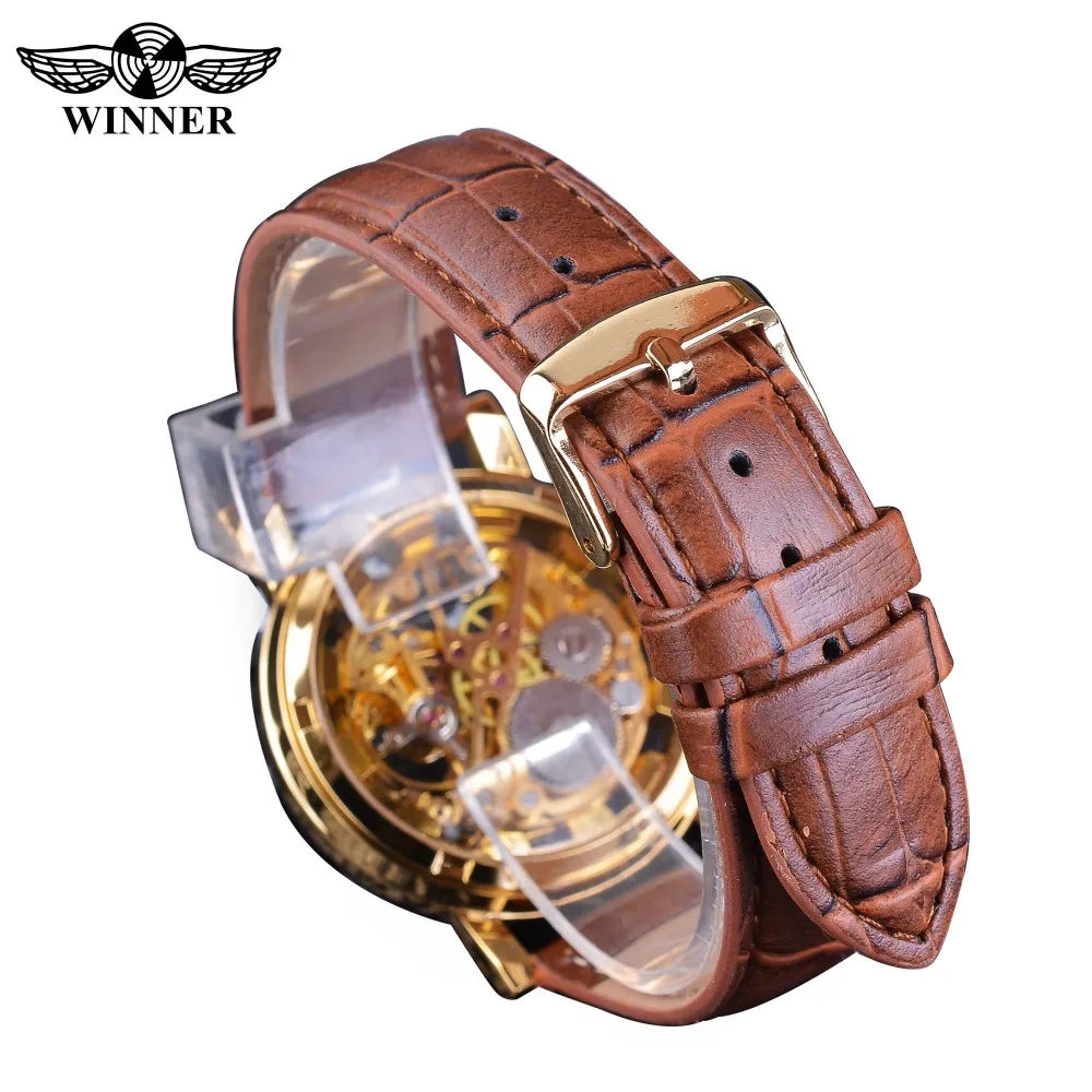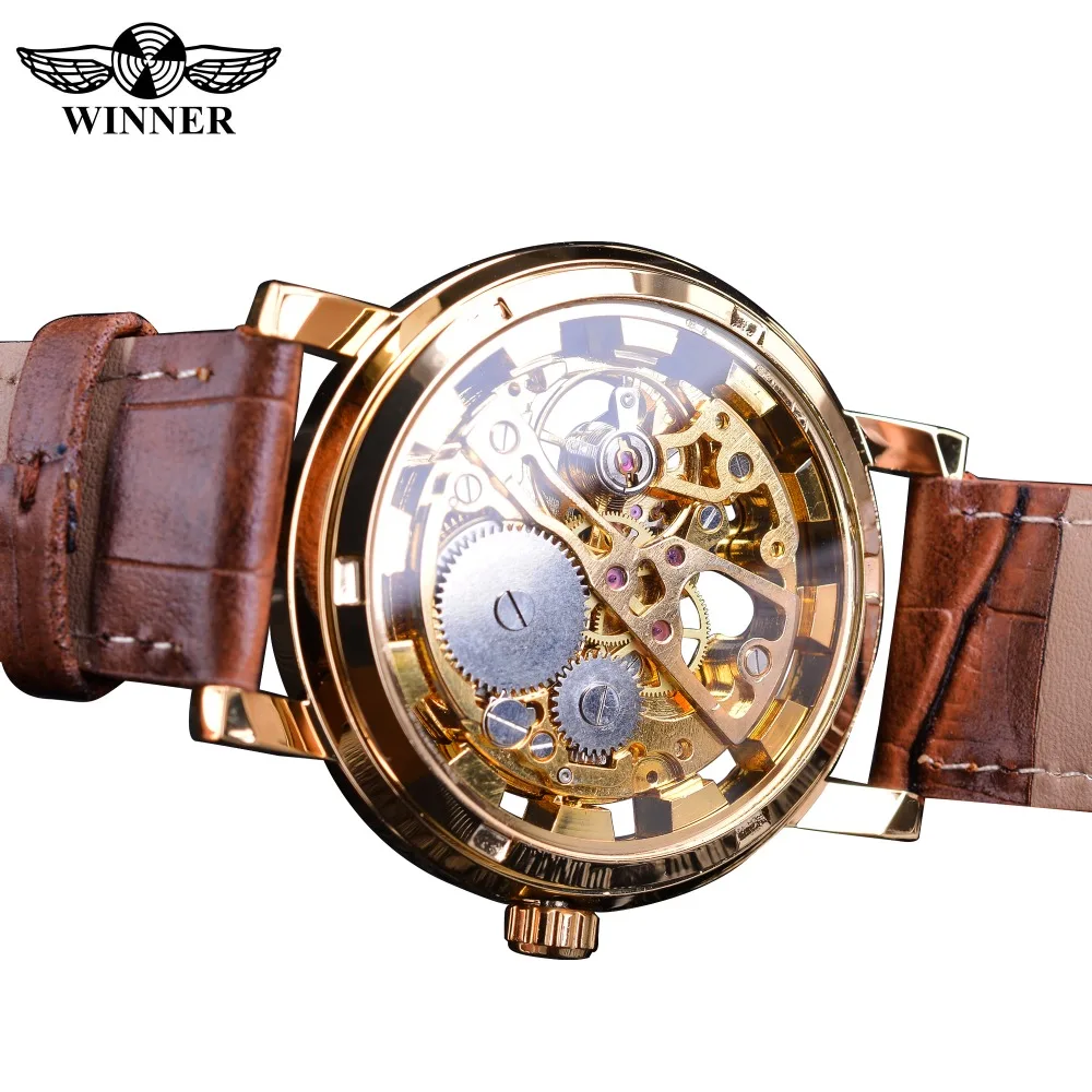 Наручные часы Winner мужские с прозрачным золотистым ремешком, повседневные брендовые роскошные механические часы-скелетоны с коричневым кожаным ремешком