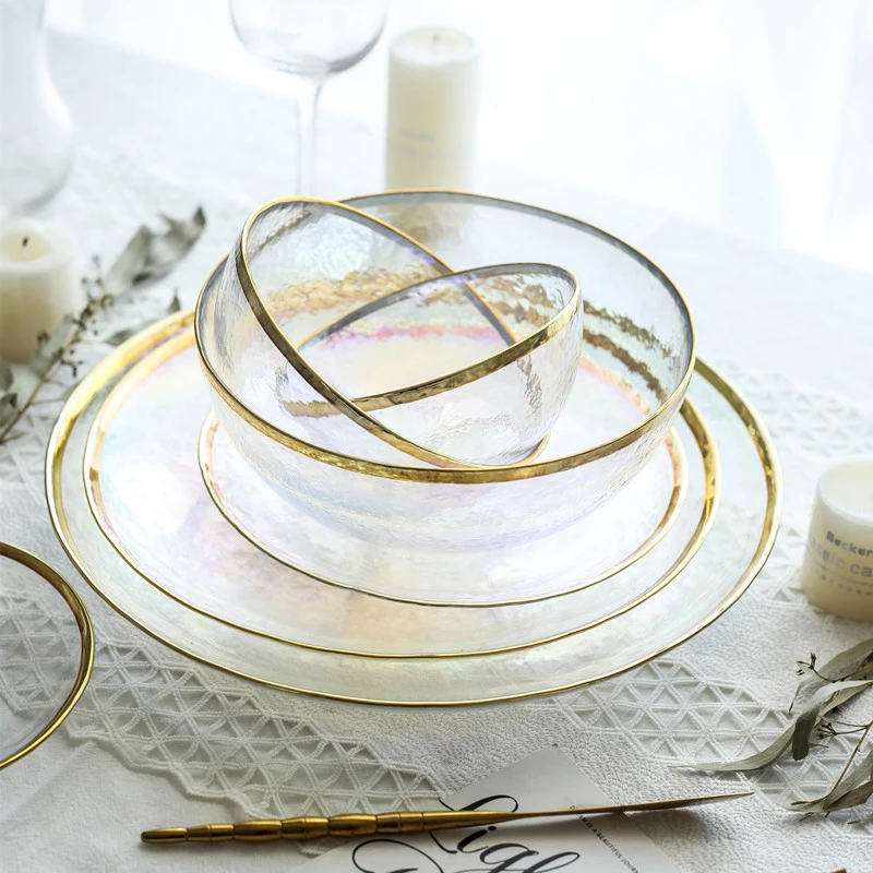 Разноцветная стеклянная посуда, тарелка для десерта, салата, западное блюдо, креативный обеденный поднос, тарелка для фруктов, столовая посуда набор тарелок