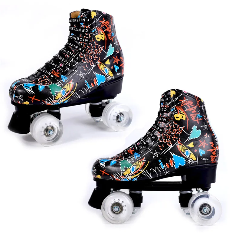 Коньки-ролики с граффити из микрофибры, двойные коньки, женская и мужская обувь для самостоятельного катания на коньках с белыми искусственными 4 колесами, тренировочные