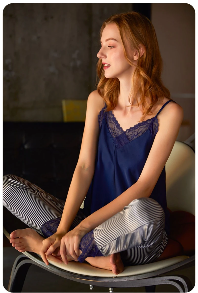 Пикантная кружевная Пижама на бретелях, домашняя одежда, тонкая пижама из вискозы, брюки, костюм из двух предметов для весны и осени, женская летняя Пижама