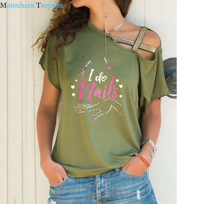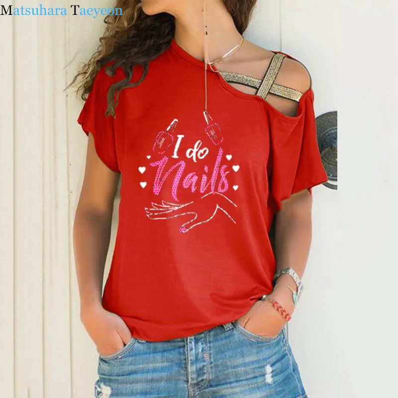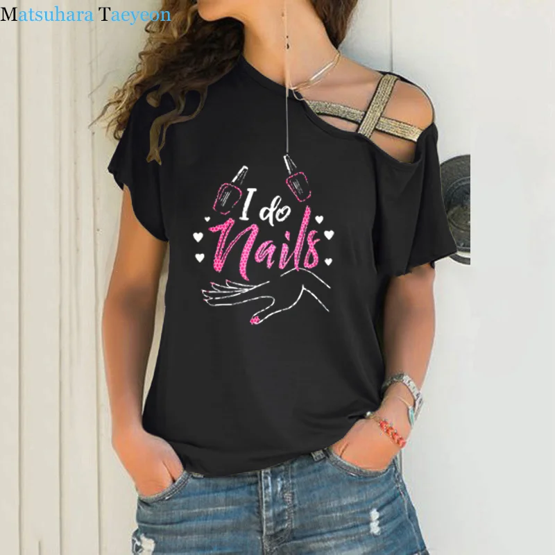 Новая модная футболка для маникюра, женская футболка с принтом, хлопковые повседневные Забавные футболки, Асимметричный топ с косым ногтем и перекрестным поясом, футболка