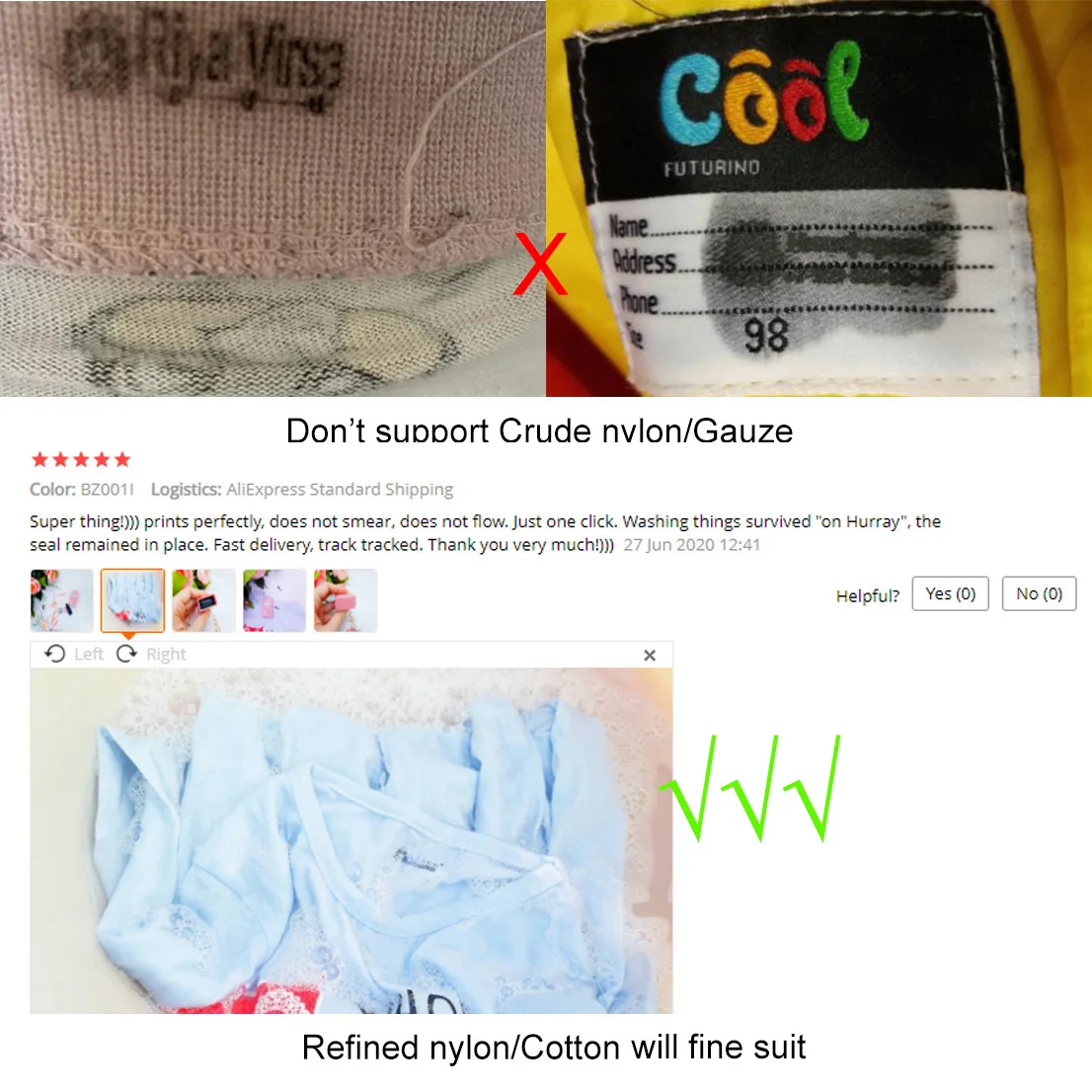 Покупкой очень довольна. Продавец сделал все в соответствии с моими пожеланиями, цвет штампа, шрифт, рисунок. Написано без ошибок. Каждый штамп в отдельной упаковке, в заказ добавили ленточки для темной одежды. На одежде ещё не проверяла. Потом дополню отзыв. Рекомендую!