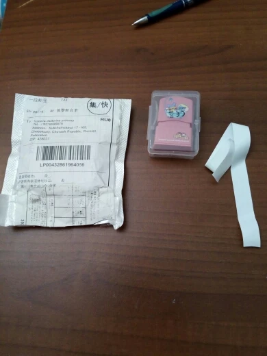 Все хорошо. Все работает. Текст написали правильно. Отлично печатает. Имеется лента в комплекте. Пока штампик новый, чернила пропечатывают на обратную сторону изделия. После стирки цвет надписи немного светлеет. В целом удобная вещь в использовании и нужная для тех, у кого дети ходят в садик и в школу, а также для тех, косу нужно подписать индивидуальные вещи. Доставка - месяц.