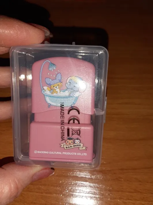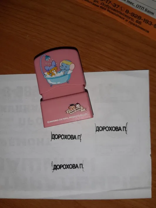 отличный штампик нам очень понравился,хорошо подходит обозначать вещи чтоб не путать.
