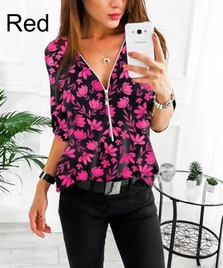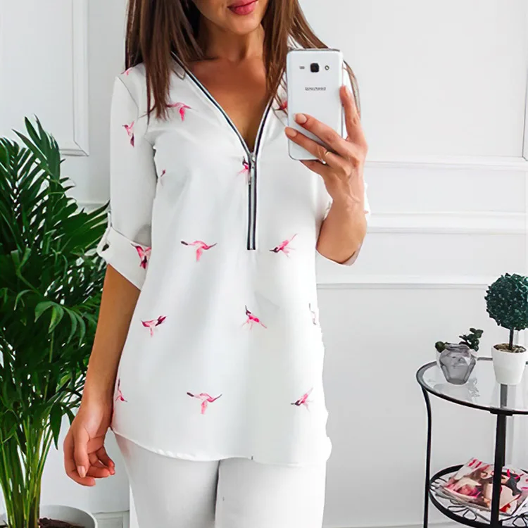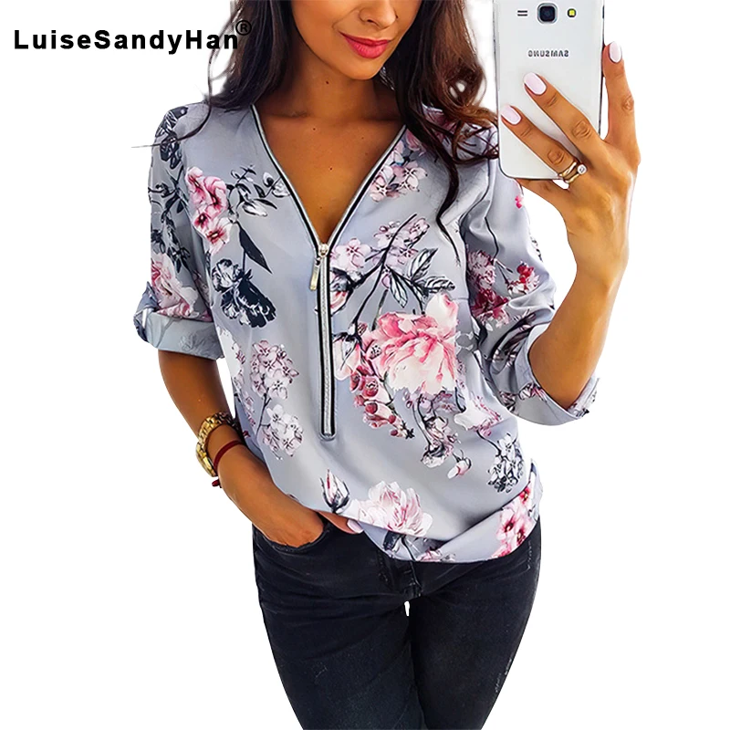 Женская летняя тонкая рубашка с принтом, с v-образным вырезом, с длинным рукавом, на молнии, весна 2020