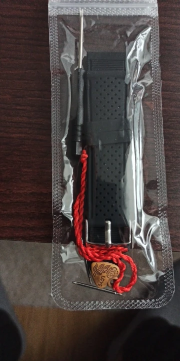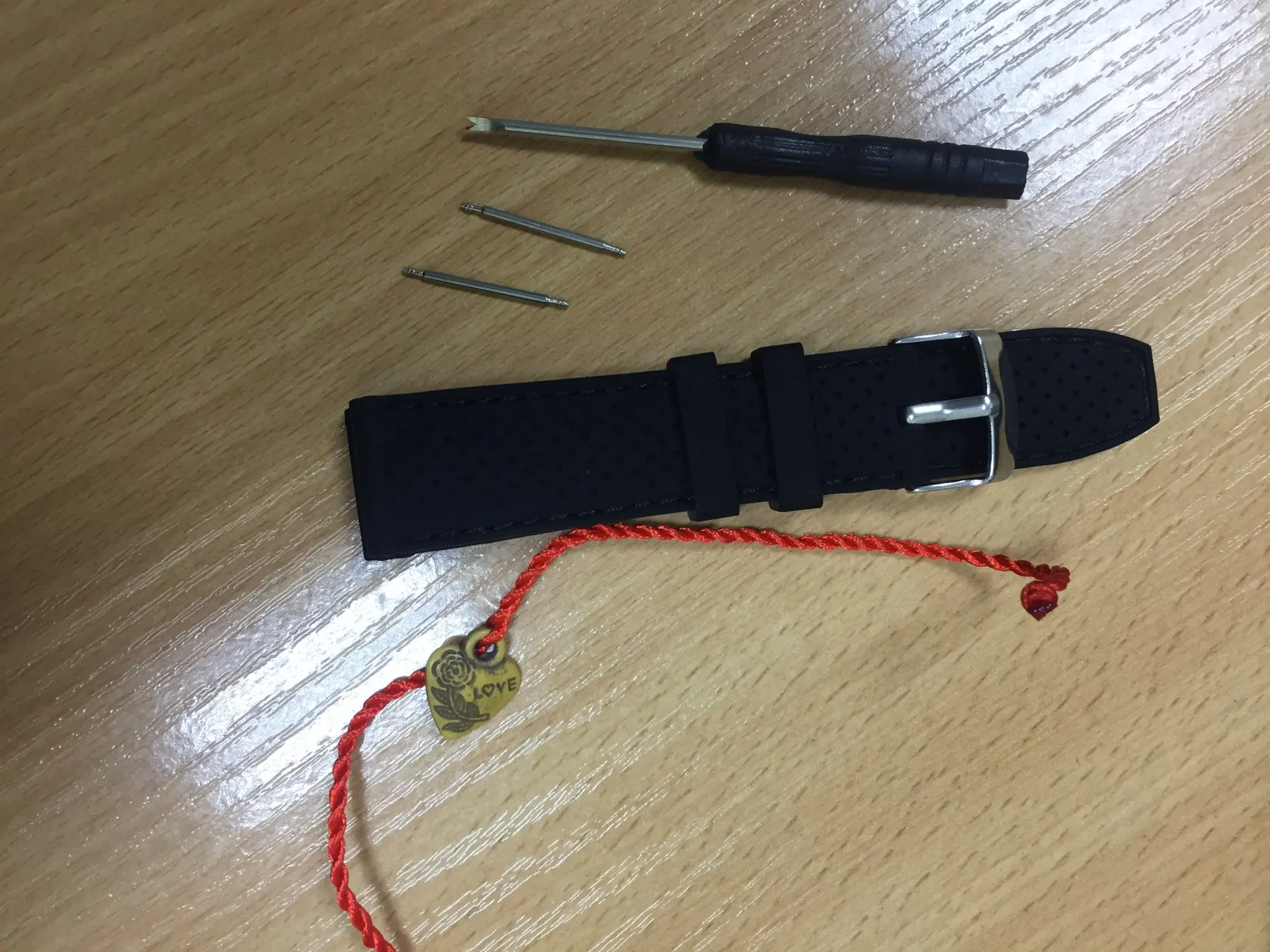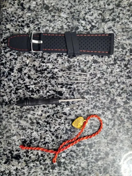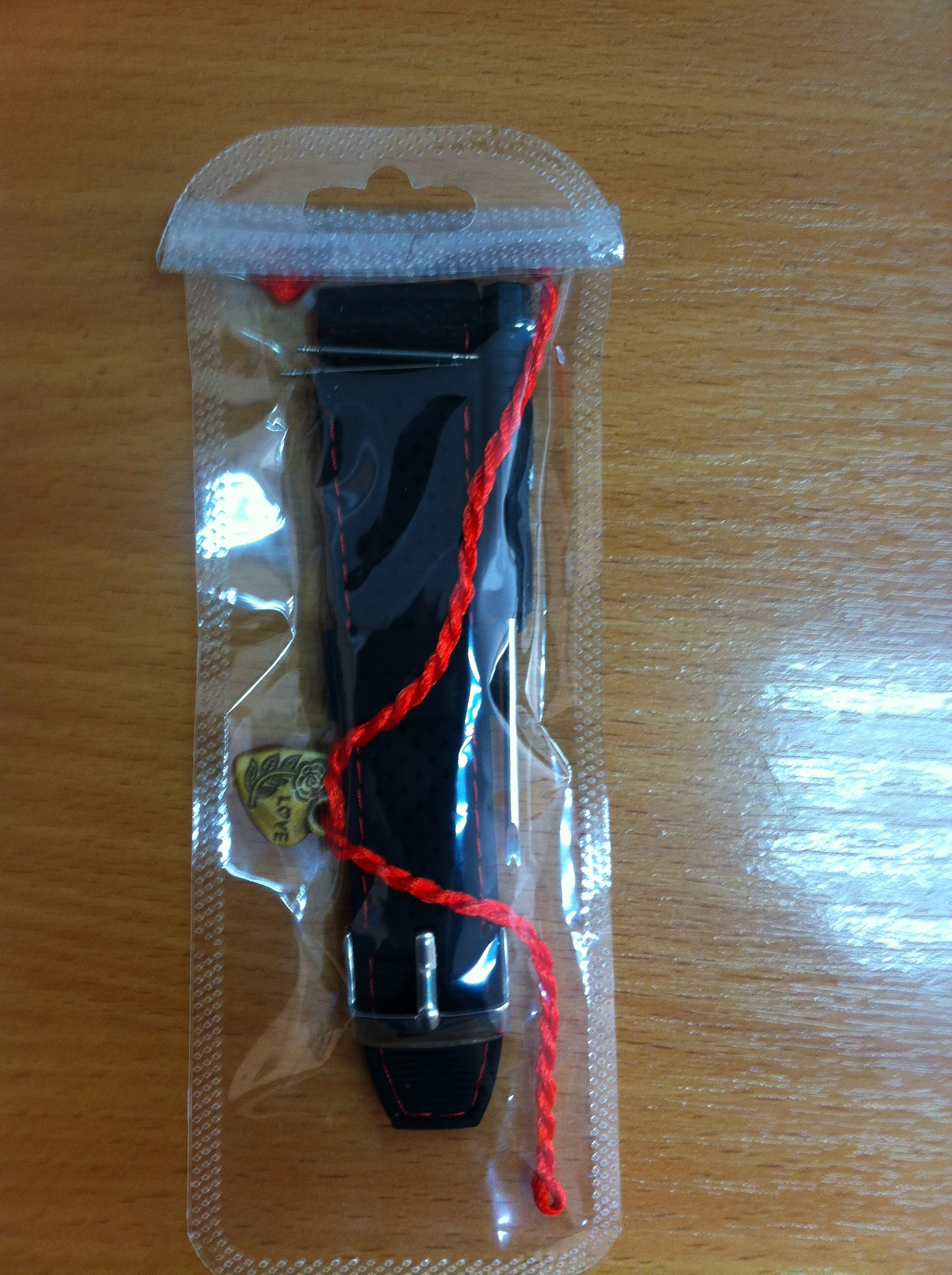 Ремешок отличный.На ощупь что-то среднее между пластиком и резиной.В комплекте два фиксатора ремешка в корпусе часов и что-то вроде отвёртки с раздвоенным жалом (ласточкин хвост).Застёгивается хорошо.Правда на данный момент срок его эксплуатации совсем небольшой,поэтому на сколько его хватит сказать сложно.