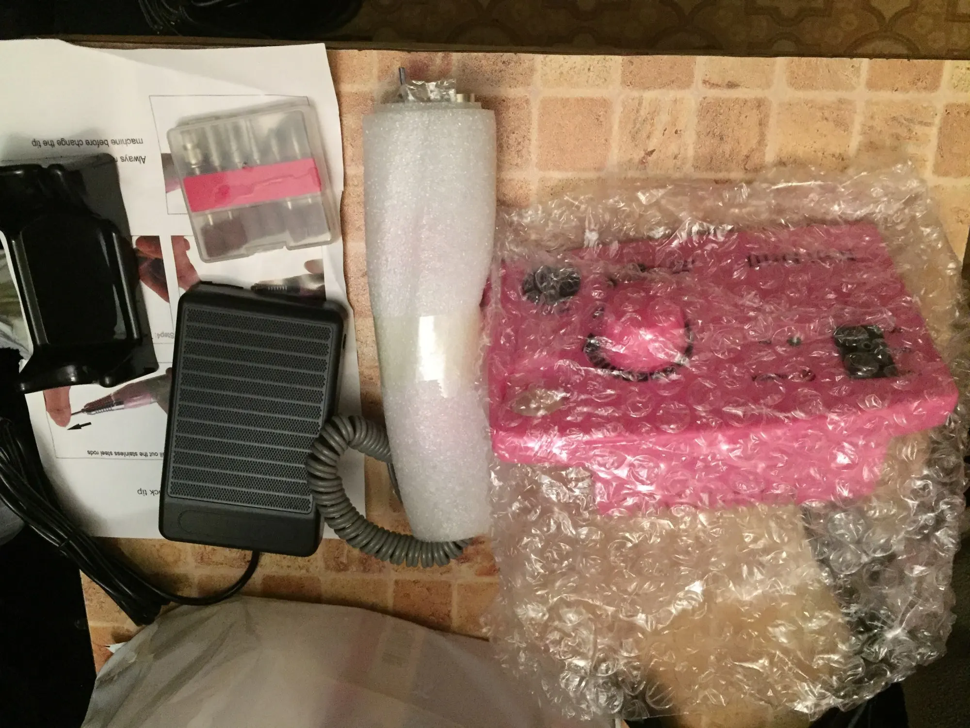 Компанию СДЭК благодарю за доставку 11 дней. Упаковано качественно. С продавцом общаться не пришлось. Аппарат отличный, скоростью довольна, абсолютно не шумный, работает в двух направлениях. Ручка удобная. Довольна педалью, очень удобно. Фрезы хорошие. Минус-провод спираль, не растягивается т. к. дубовый, тянет за собой аппарат(легкий) и цвет дешёвый, мелоч, а дизайн подвёл. Провод - пружину буду менять.
