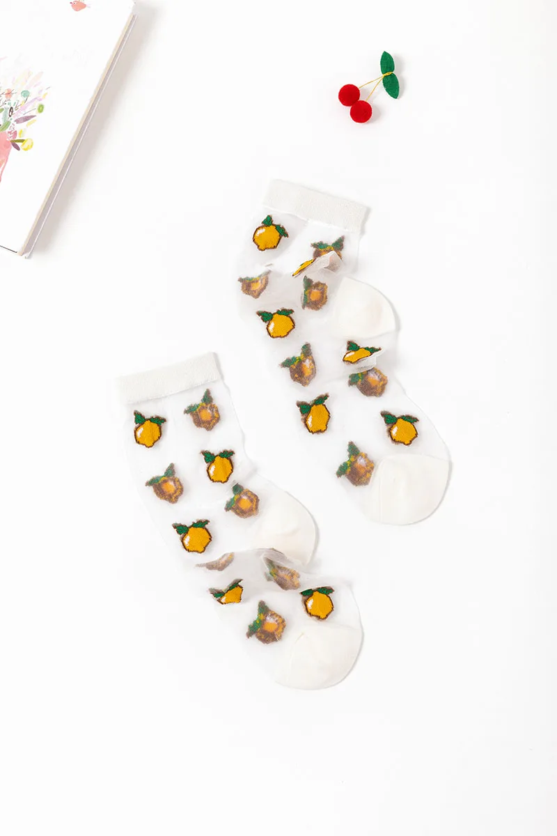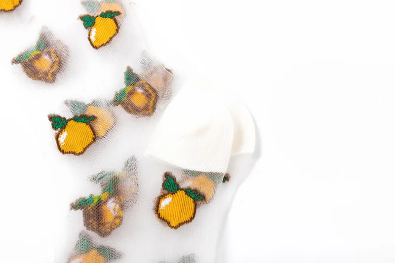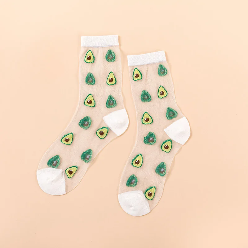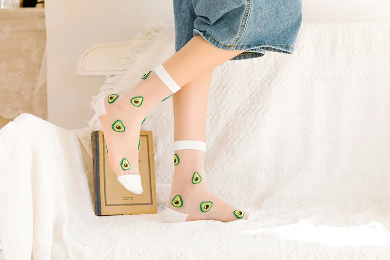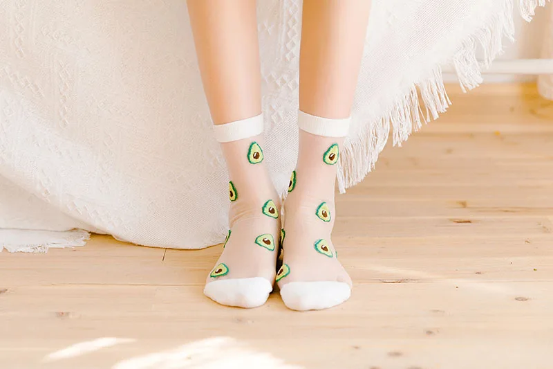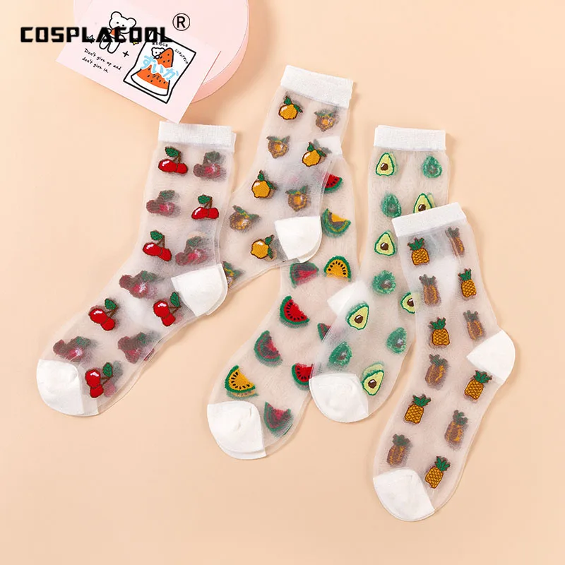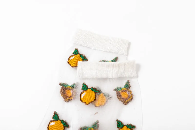 Женские прозрачные носки со смешным рисунком, милые тонкие шелковые носки Каваи с вишневым принтом авокадо, оранжевого цвета, в стиле Харадзюку