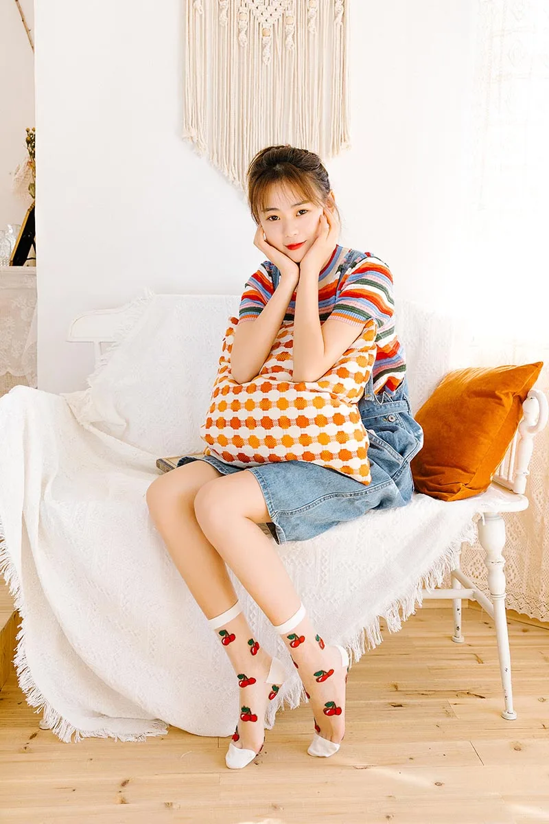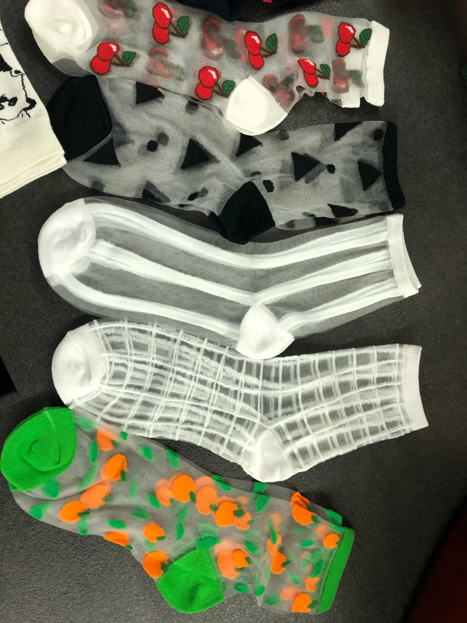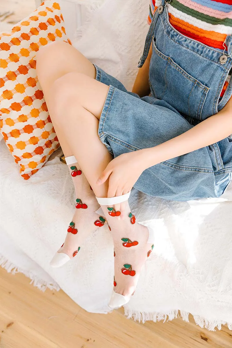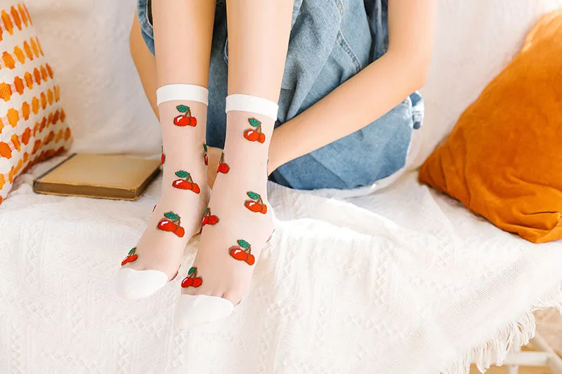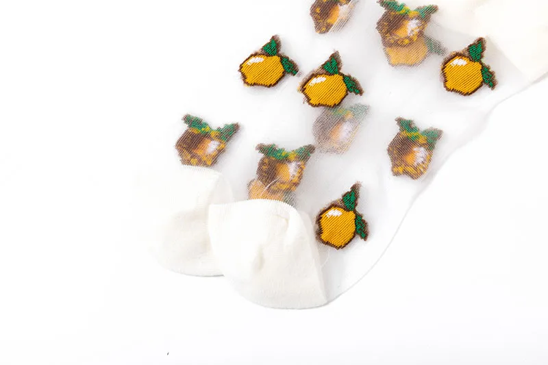 Женские прозрачные носки со смешным рисунком, милые тонкие шелковые носки Каваи с вишневым принтом авокадо, оранжевого цвета, в стиле Харадзюку