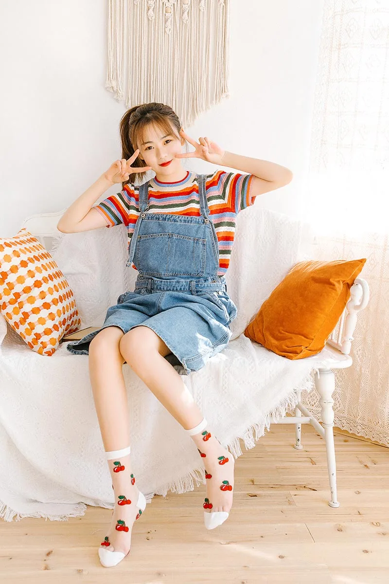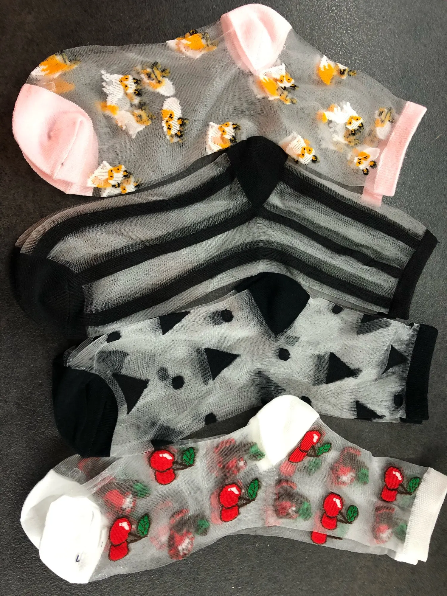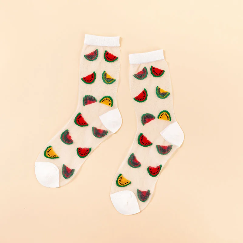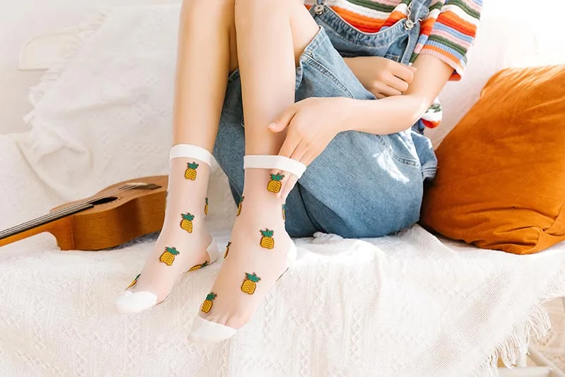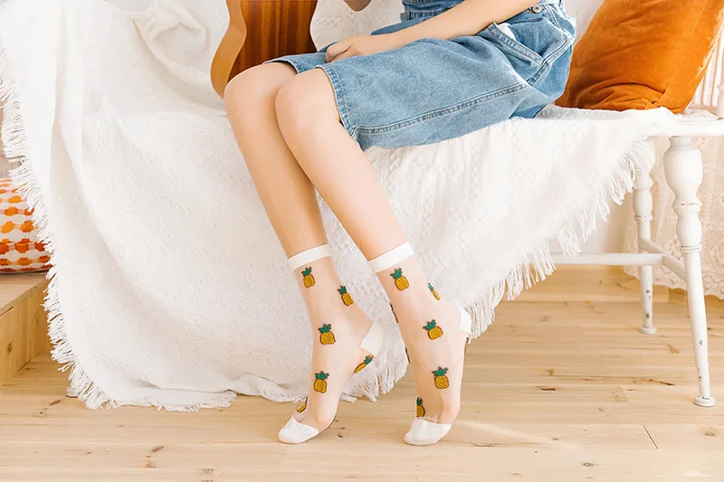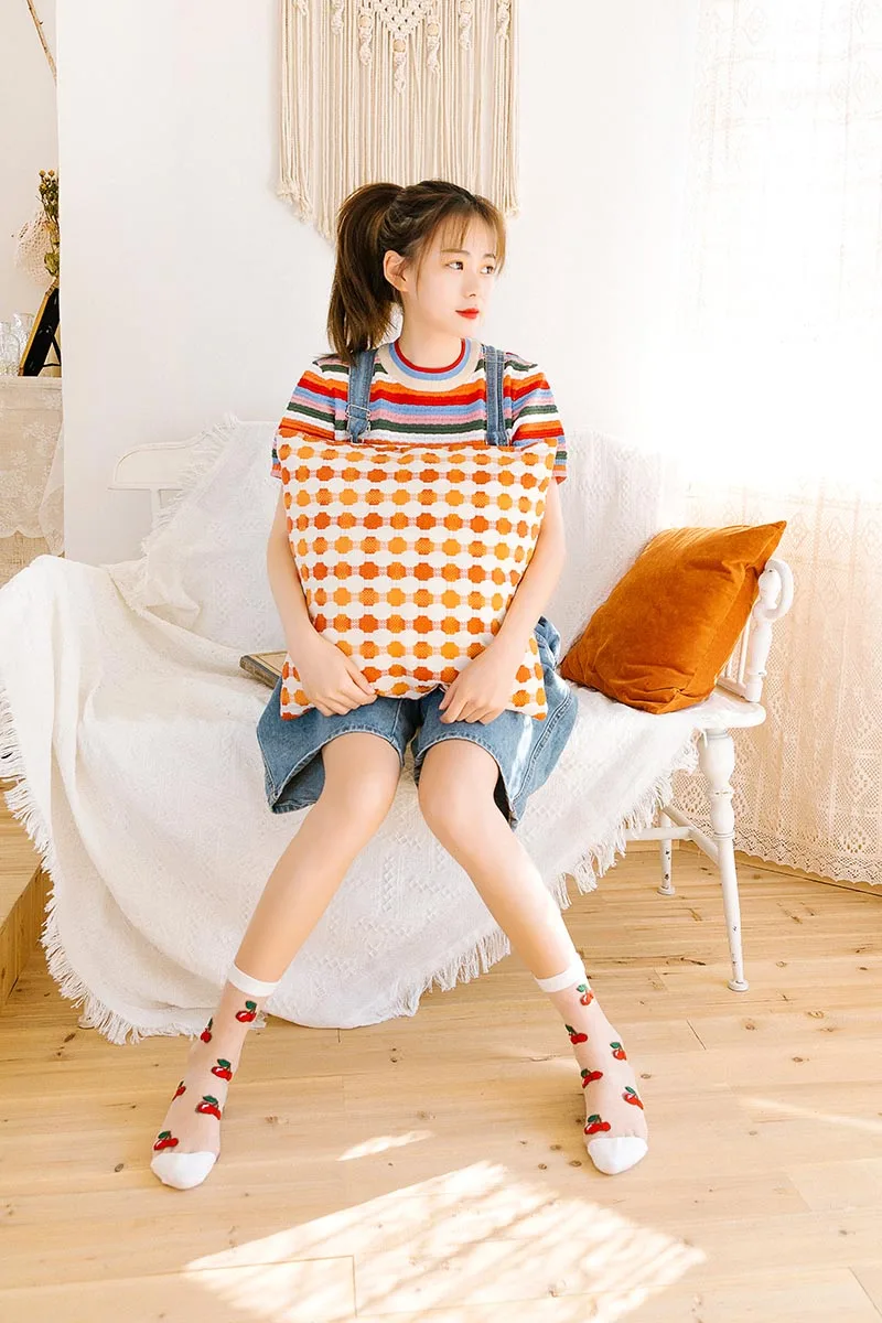 Женские прозрачные носки со смешным рисунком, милые тонкие шелковые носки Каваи с вишневым принтом авокадо, оранжевого цвета, в стиле Харадзюку