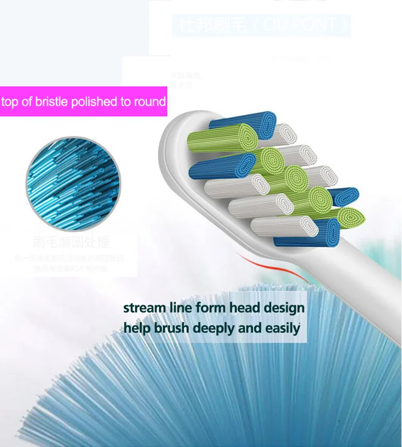 Каждая головка щетки упакована в пылезащитный колпачок, они вакуумно упакованы, чтобы предотвратить загрязнения и бактерии, безопасны для здоровья и гигиены. Скругленная щетина Dupont защищает Десна от жестких расчесываний.